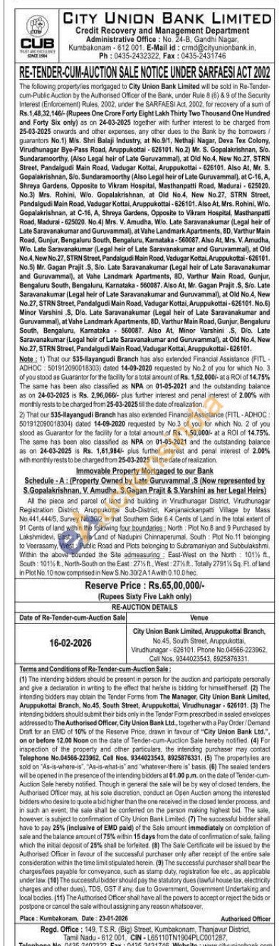 All the piece and parcel of land and building in Vrudhunagar Distict, Virudhunagar Registration District, Aruppukottal Sub-Din, Kanjanakarpatt Vitage by Mass No 441, 4445. Survey No.302 in that Southern Side 64 Cants of Land in the the lokal total extent of 91 Cents of land within the folowing tour boundaries North Plot No 8 and 9 Punhased by Lakshmidevi East Punja Land of Nadupini Chinnaperumal South Plot No 11 belonging to Veerasamy West Public Road and Picts belonging to Subramaniyan and Subbulakshm Within the above bounded the Site admessining East West on the North 101% South: 101% North-South on the East: 27%ft, West: 27% ft. Totally 279114 Sq FLf land in Plothio to now competin New & No.30/2A1Awith 100 hec