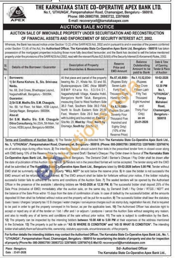 All that piece and parcel of the property bearing No. 21, Khata No. 53 and 55. Byatarayanapura CMC (Now BBMP) BBMP Khata No. 53/54/21, Nagashettyhalli Village, Kasaba Hobli, Bangalore North Taluk, Bangalore, measuring East to West Northem Side 38.0 Feet, Southern Side 39.0 Feel. North to South Eastern Side 25.00 Feet, Western Side 29.0 feet along with building and bounded on: East by: Site No. 20, West by: Road, North by: Drainage, South by: Site No.22.