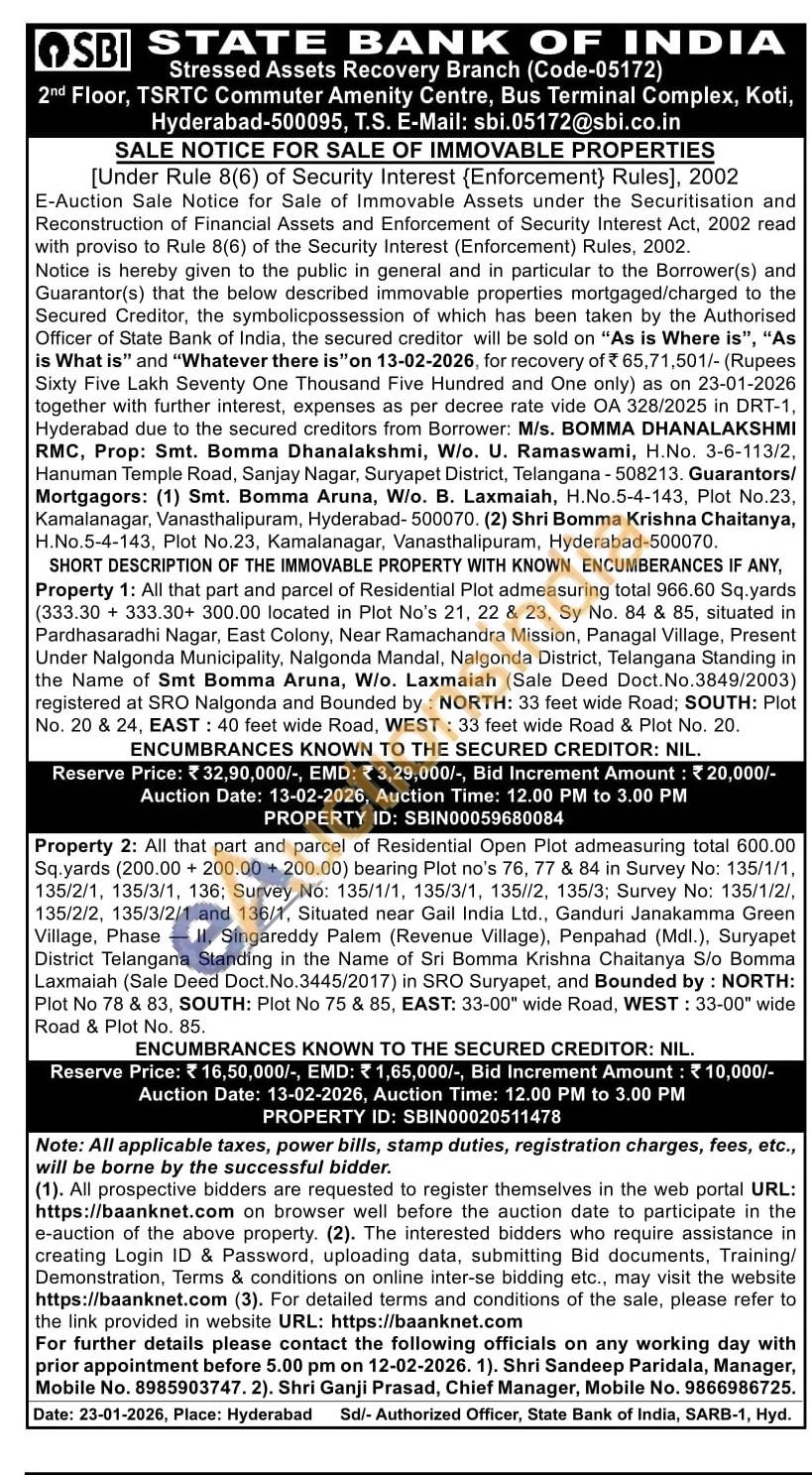 All that part and parcel of Residential Open Plot admeasuring total 600.00 Sq.yards (200.00 +200.00+200.00) bearing Plot no's 76, 77 & 84 in Survey No: 135/1/1, 135/2/1, 135/3/1, 136; Survey No: 135/1/1, 135/3/1, 135//2, 135/3; Survey No: 135/1/2/, 135/2/2, 135/3/2/1 and 136/1, Situated near Gail India Ltd., Ganduri Janakamma Green Village, Phase II, Singareddy Palem (Revenue Village), Penpahad (Mdl.), Suryapet District Telangana Standing in the Name of Sri Bomma Krishna Chaitanya S/o Bomma Laxmaiah (Sale Deed Doct. No.3445/2017) in SRO Suryapet, and Bounded by: NORTH: Plot No 78 & 83, SOUTH: Plot No 75 & 85, EAST: 33-00" wide Road, WEST: 33-00" wide Road & Plot No. 85.