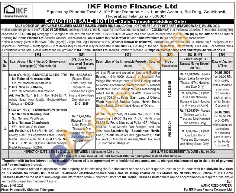 All that Piece and parcel of land and Building Bearing 4-2-in 0009 situated at Medipalli Pm Village, Bheemunipatnam hill Area, Ramagundam Municipal Corporation Ramagundam & Mandal Peddapalli District Telangana Land Measuring an extent 148.88 Sq. Yards and ACC House Plinth area of 708.00 sq. Feets. East: Land of Others, West: House of Suddala Gopal, North: Road, South: Newly Constructed House of Others