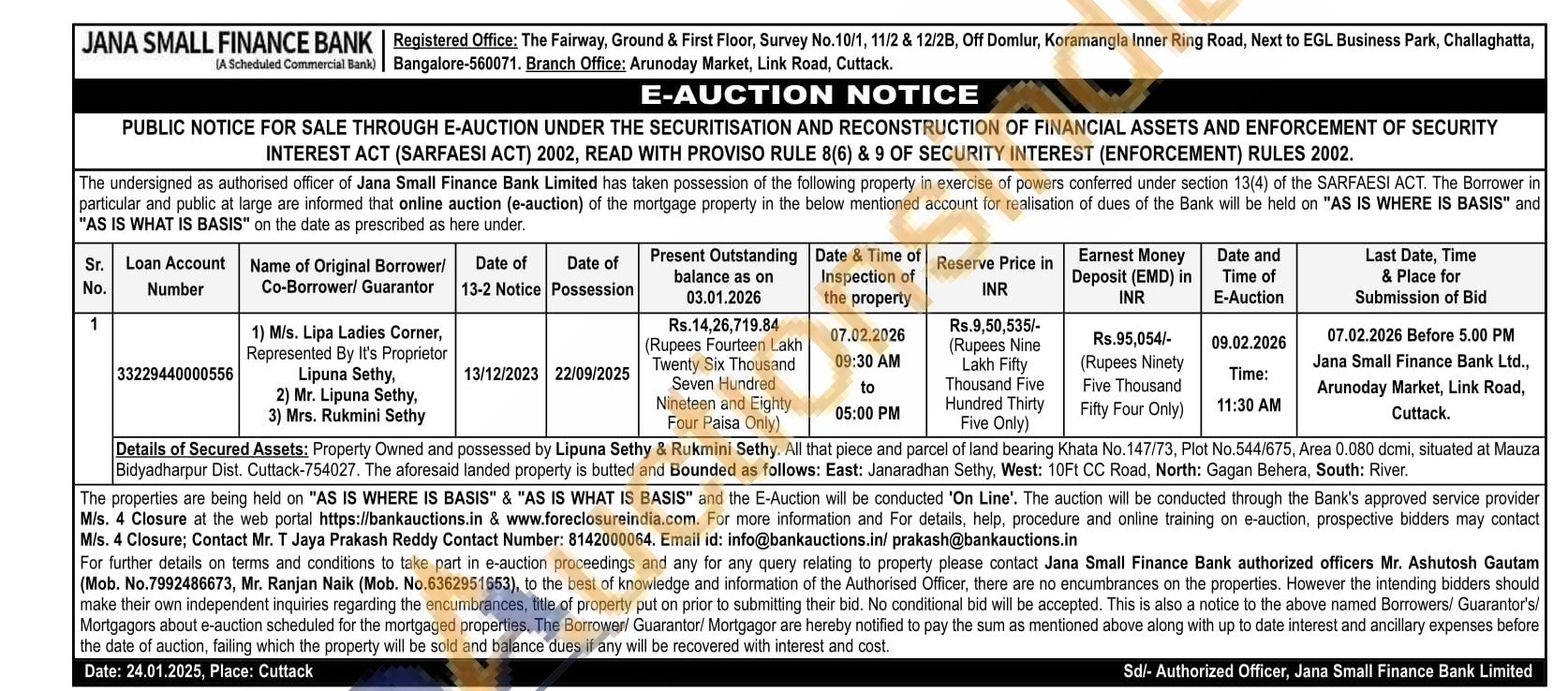 Details of Secured Assets: Property Owned and possessed by Lipuna Sethy & Rukmini Sethy. All that piece and parcel of land bearing Khata No. 147/73, Plot No.544/675, Area 0.080 dcmi, situated at Mauza Bidyadharpur Dist. Cuttack-754027. The aforesaid landed property is butted and Bounded as follows: East: Janaradhan Sethy, West: 10Ft CC Road, North: Gagan Behera, South: River