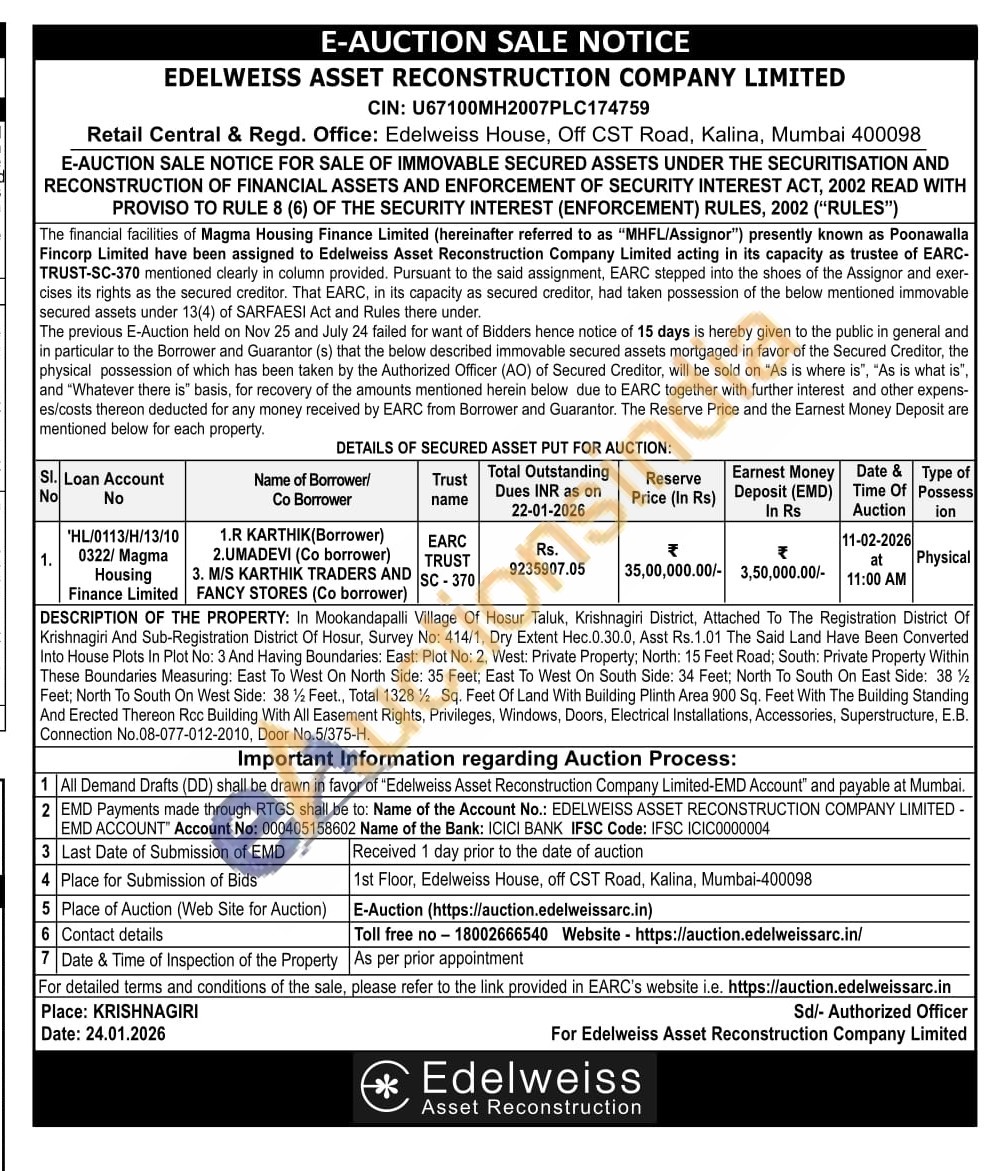 DESCRIPTION OF THE PROPERTY: In Mookandapalli Village Of Hosur Taluk, Krishnagiri District, Attached To The Registration District Of Krishnagiri And Sub-Registration District Of Hosur, Survey No: 414/1, Dry Extent Hec.0.30.0, Asst Rs.1.01 The Said Land Have Been Converted Into House Plots In Plot No: 3 And Having Boundaries: East: Plot No: 2, West: Private Property; North: 15 Feet Road; South: Private Property Within These Boundaries Measuring: East To West On North Side: 35 Feet; East To West On South Side: 34 Feet; North To South On East Side: 38½ Feet; North To South On West Side: 38½ Feet., Total 1328½ Sq. Feet Of Land With Building Plinth Area 900 Sq. Feet With The Building Standing And Erected Thereon Rcc Building With All Easement Rights, Privileges, Windows, Doors, Electrical Installations, Accessories, Superstructure, E.B. Connection No.08-077-012-2010, Door No.5/375-H.