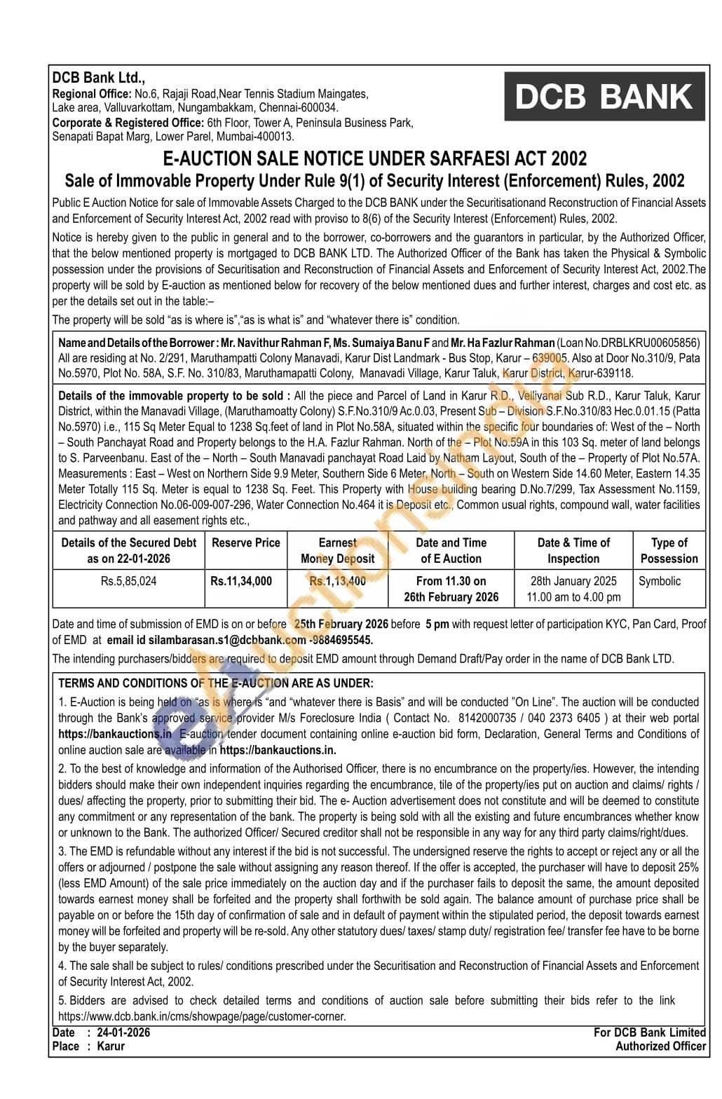 All the piece and Parcel of Land in Karur R.D., Velliyanai Sub R.D., Karur Taluk, Karur District, within the Manavadi Village, (Maruthamoatty Colony) S.F.No.310/9 Ac.0.03, Present Sub-Division S.F.No.310/83 Hec.0.01.15 (Patta No.5970) i.e., 115 Sq Meter Equal to 1238 Sq feet of land in Plot No.58A, situated within the specific four boundaries of: West of the North -South Panchayat Road and Property belongs to the H.A. Fazlur Rahman. North of the Plot No.59A in this 103 Sq. meter of land belongs to S. Parveenbanu. East of the North-South Manavadi panchayat Road Laid by Natham Layout, South of the Property of Plot No.57A. Measurements: East-West on Northern Side 9.9 Meter, Southern Side 6 Meter, North-South on Westem Side 14.60 Meter, Eastern 14.35 Meter Totally 115 Sq. Meter is equal to 1238 Sq. Feet. This Property with House building bearing D.No. 7/299, Tax Assessment No. 1159, Electricity Connection No.06-009-007-296, Water Connection No.464 it is Deposit etc., Common usual rights, compound wall, water facilities and pathway and all easement rights etc.,