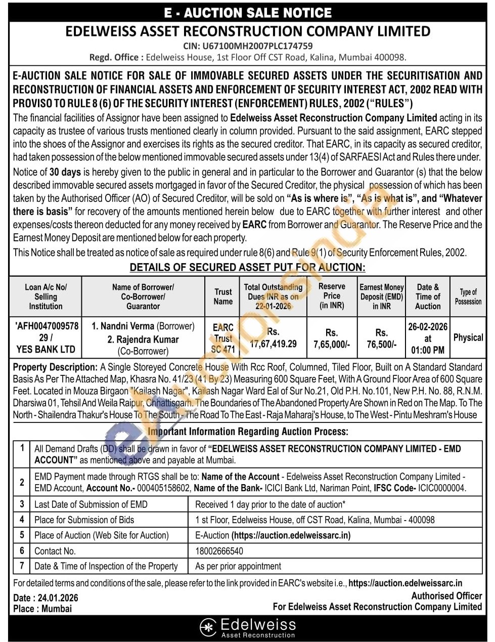 A Single Storeyed Concrete House With Rcc Roof, Columned, Tiled Floor, Built on A Standard Standard Basis As Per The Attached Map, Khasra No. 41/23 (41 By 23) Measuring 600 Square Feet, With A Ground Floor Area of 600 Square Feet. Located in Mouza Birgaon "Kailash Nagar", Kailash Nagar Ward Eal of Sur No.21, Old P.H. No. 101, New P.H. No. 88, R.N.M. Dharsiwa 01, Tehsil And Weila Raipur, Chhattisgarh. The Boundaries of The Abandoned Property Are Shown in Red on The Map. To The North-Shailendra Thakur's House To The South - The Road To The East-Raja Maharaj's House, to The West-Pintu Meshram's House