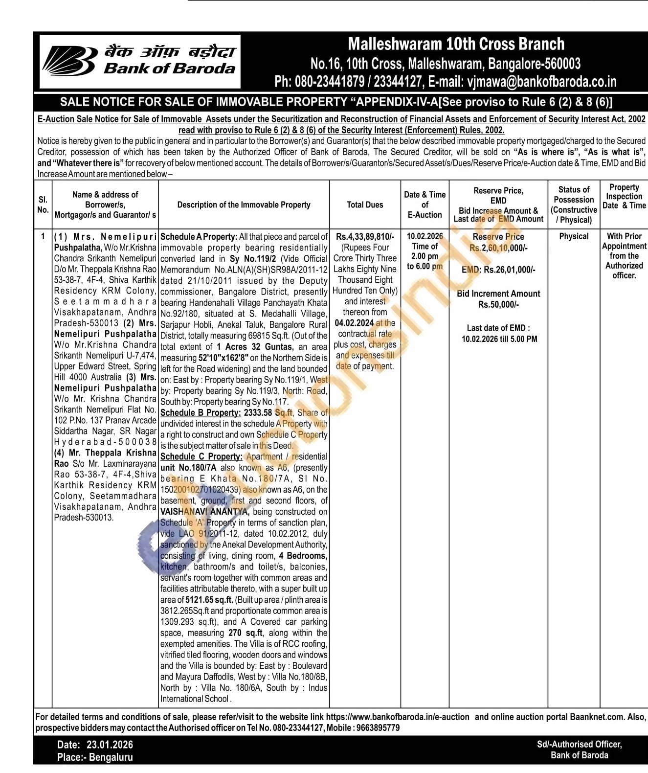 Schedule A Property: All that piece and parcel of immovable property bearing residentially converted land in Sy No.119/2 (Vide Official Memorandum No.ALN(A) (SH)SR98A/2011-12 dated 21/10/2011 issued by the Deputy commissioner, Bangalore District, presently bearing Handenahalli Village Panchayath Khata No.92/180, situated at S. Medahalli Village, Sarjapur Hobli, Anekal Taluk, Bangalore Rural District, totally measuring 69815 Sq.ft. (Out of the total extent of 1 Acres 32 Guntas, an area measuring 52'10"x162'8" on the Northern Side is left for the Road widening) and the land bounded on: East by: Property bearing Sy No. 119/1, West by: Property bearing Sy No.119/3, North: Road, South by: Property bearing Sy No.117.