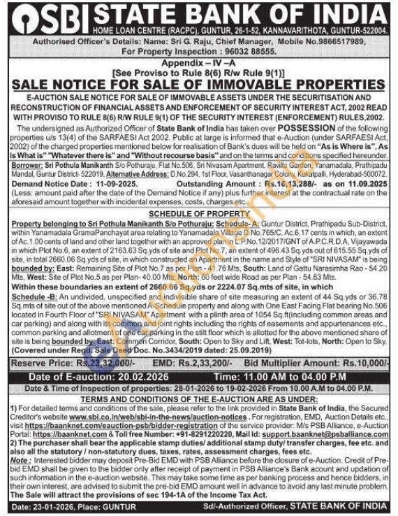 Property belonging to Sri Pothula Manikanth Sio Pothuraju: Schedule-A: Guntur District, Prathipadu Sub-District, within Yanamadala GramaPanchayat area relating to Yanamadala Village D. No. 765/C, Ac.6.17 cents in which, an extent of Ac. 1.00 cents of land and other land together with an approved plan in L.P.No. 12/2017/GNT of A.P.C.R.D.A, Vijayawada in which Plot No.6, an extent of 2163.63 Sq yds of site and Plot No.7, an extent of 496.43 Sq.yds out of 615.55 Sq.yds of site, in total 2660.06 Sq.yds of site, in which constructed an Apartment in the name and Style of "SRI NIVASAM" is being bounded by: East: Remaining Site of Plot No.7 as per Plan-41.76 Mts, South: Land of Gattu Narasimha Rao-54.20 Mts, West: Site of Plot No.5 as per Plan-40.00 Mts, North: 60 feet wide Road as per Plan-54.63 Mts. Within these boundaries an extent of 2660.06 Sq.yds or 2224.07 Sq.mts of site, in which Schedule -B: An undivided, unspecified and indivisible share of site measuring an extent of 44 Sq.yds or 36.78 Sq.mts of site out of the above mentioned A-Schedule property and along with One East Facing Flat bearing No. 506 located in Fourth Floor of "SRI NIVASAM Apartment with a plinth area of 1054 Sq.ft(including common areas and car parking) and along with its common and joint rights including the rights of easements and appurtenances etc., common parking and allotment of one car parking in the stilt floor which is allotted for the above mentioned share of site is being bounded by: East: Common Corridor, South: Open to Sky and Lift, West: Tot-lots, North: Open to Sky