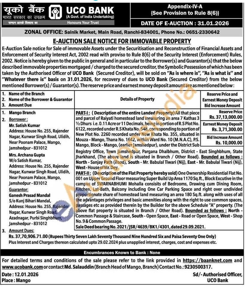 All that piece and parcel of Raiyati homestead land measuring an area 7 Kathas 3 1/2 Dhurs i.e. 0.11 Acre or 11 Decimals, being in portion of R.S Plot No. 6122, recorded under R.S Khata No. 548, corresponding to portion of New Plot No. 2260 recorded under New Khata No. 355, situated in Mouza - Mango, Thana No. 1642, within Ward No. 10 (M.N.A.C), P.S. Mango, Block-Mango, (earlier Jamshedpur), under the District Sub Registry Office, Town Jamshedpur, Pargana Dhalbhum, District East Singhbhum, State Jharkhand, (The above land is situated in Branch / Other Road). Bounded as follows: North - Sanjay Path (Road), South - Mr. Babulal Tiwari (Nij), East - Mr. Babulal Tiwari (Nij), West-House of Mr. Dey. PART-II: (Description of the Flat Property hereby sold) One Ownership Residential Flat No. 001 on Upper Ground Floor measuring Super Build Up Area 1170 Sq.ft., Block Excutive in the campus of SWARNABHUMI Mohalla consisits of Bedrooms, Drawing cum Dining Room, Kitchen, Lat-Bath, Balcony including One Car Parking Space and right over undivided proportionate share of homestead land measuring an area 180 Sq.ft. along with uses of all the advantages privileges and basic amenities along with the right to use common spaces, passages etc as provided therein by the Builder for the above Schedule "A" property. (The above flat property is situated in Branch / Other Road). Bounded as follows: North -Common Passage & Staircase, South - Open Space, East - Road or Open Space, West - Shop No. 9 & Common Passage. Sale Deed bearing No. 2021/JSR/4639/BK1/4301, dated 29.09.2021.