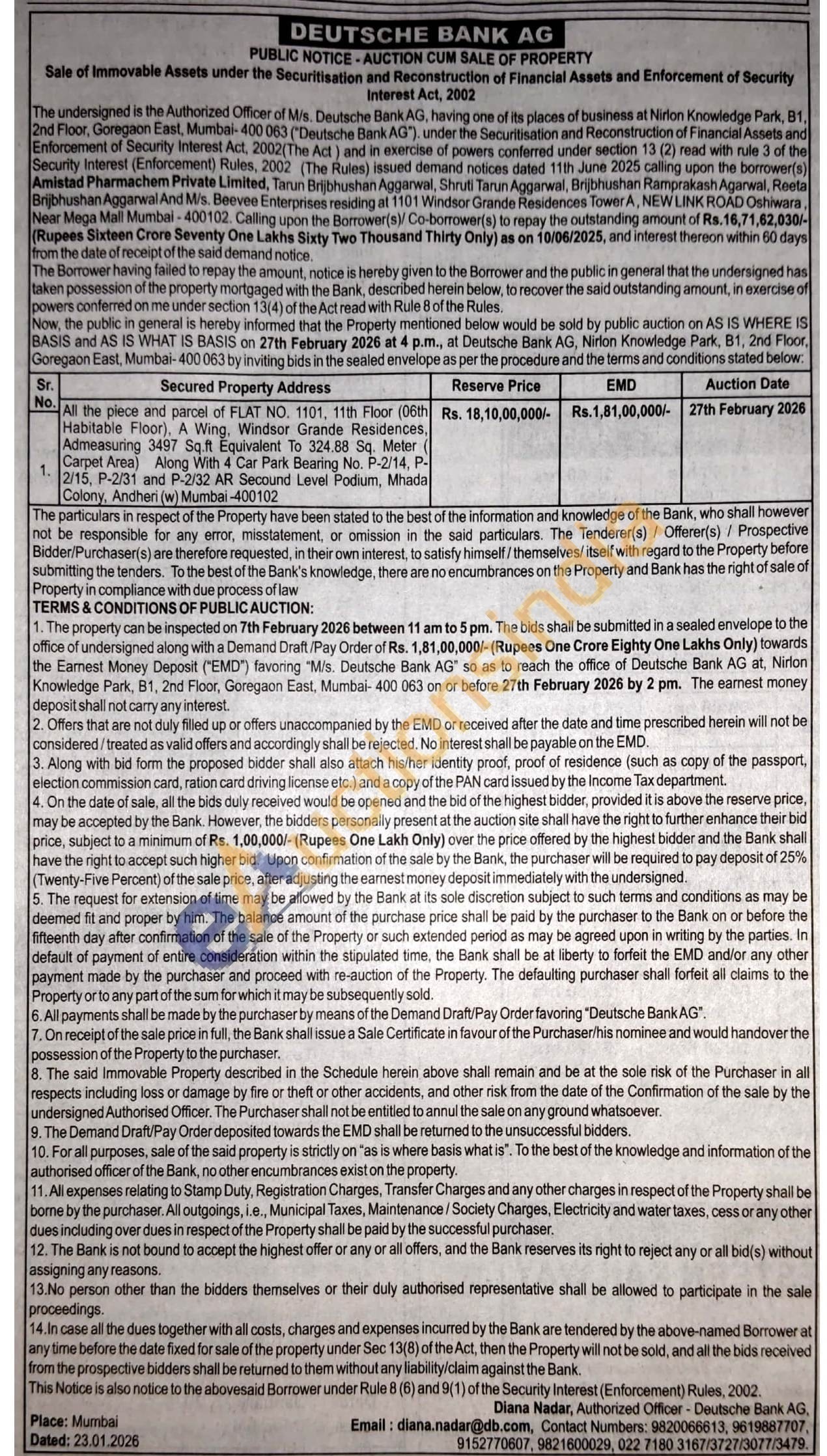 All the plece and parcel of FLAT NO. 1101, 11th Floor (06th Habitable Floor), A Wing, Windsor Grande Residences. Admeasuring 3497 Sq.ft Equivalent To 324.88 Sq. Meter Carpet Area) Along With 4 Car Park Bearing No. P-2/14, P- 2/15, P-2/31 and P-2/32 AR Secound Level Podium, Mhada Colony, Andheri (w) Mumbai-400102