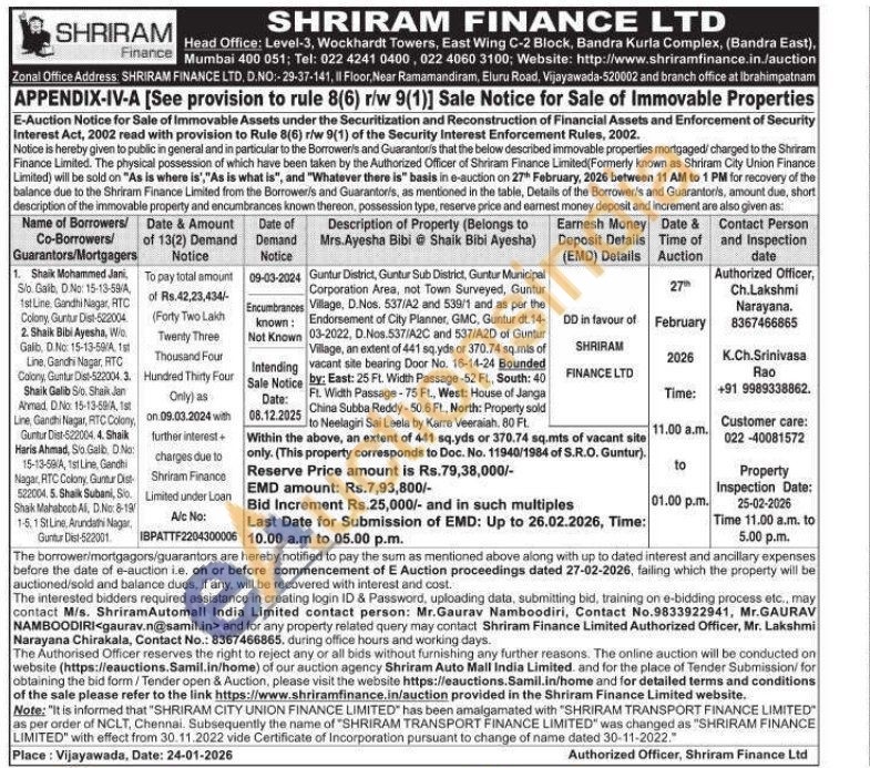 Guntur District, Guntur Sub District, Guntur Municipal Corporation Area, not Town Surveyed, Guntur Village, D.Nos. 537/A2 and 539/1 and as per the Endorsement of City Planner, GMC, Guntur dt. 14-03-2022, D.Nos.537/A2C and 537/A2D of Guntur Village, an extent of 441 sq.yds or 370.74 sq.mts of vacant site bearing Door No. 16-14-24 Bounded by: East: 25 Ft. Width Passage-52 Ft., South: 40 Ft. Width Passage-75 FL, West: House of Janga China Subba Reddy-50.6 FL, North: Property sold to Neelagiri Sai Leela by Karre Veeraiah. 80 Ft.