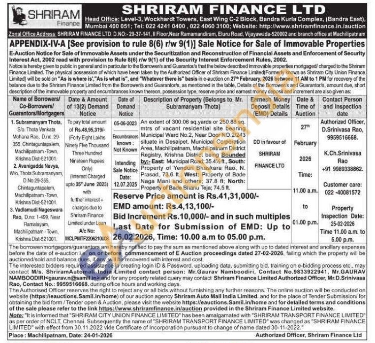 An extent of 300.06 sq yards or 250.88 sq. mtrs of vacant residential site bearing Municipal Ward No.2, Near Door NO.2/243 situate in Desaipet, Municipal Corporation Area, Machilipatnam, Machilipatnam District Registry, Krishna District being Bounded by:- East: Municipal Road, 35.4% ft., South: Property of Yenduri Bhaskara Rao, N. Prasad, 73.6 ft., West: Property of Bade Naga Mani and others; 37.8 ft; North: Property of Bade Bhanu Teja; 74,5 ft.