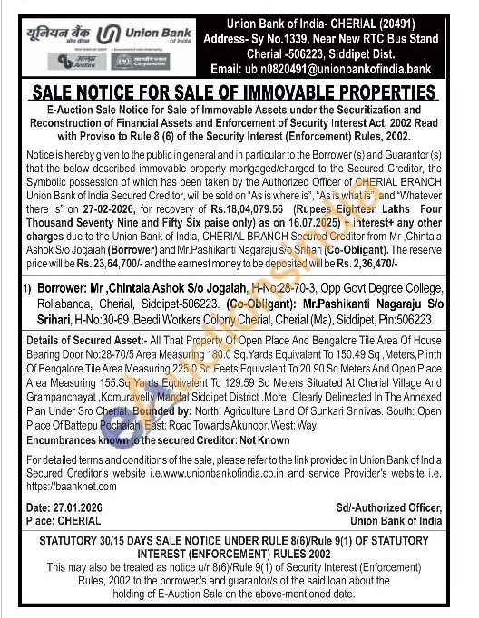 All That Property Of Open Place And Bengalore Tile Area Of House Bearing Door No:28-70/5 Area Measuring 180.0 Sq. Yards Equivalent To 150.49 Sq, Meters, Plinth Of Bengalore Tile Area Measuring 225.0 Sq. Feets Equivalent To 20.90 Sq Meters And Open Place Area Measuring 155.Sq Yards Equivalent To 129.59 Sq Meters Situated At Cherial Village And Grampanchayat, Komuravelly Mandal Siddipet District. More Clearly Delineated In The Annexed Plan Under Sro Cherial. Bounded by: North: Agriculture Land Of Sunkari Srinivas. South: Open Place Of Battepu Pochaiah. East: Road Towards Akunoor. West: Way