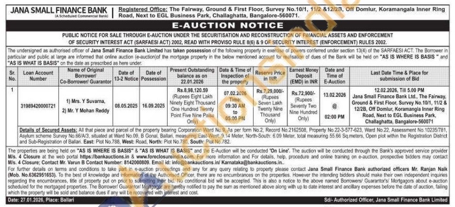 All that piece and parcel of the property bearing Corporation Ward No.9. As per form No.2, Record No.2162508, Property No. 22-3-577-623, Ward No.22. Assessment No. 10235/781, Asylum scheme Survey No.66/A/3, situated at Ward No. 09, B Gonal, Ballari, measuring East-West: 9.14 Meter, North-South: 6.09 Meter, total measuring 55 66 Sq meters, Open plot within the Registration District and Sub-Registration of Ballari. East: Plot No.788, West: Road, North: Plot No. 780, South: Plot No.782