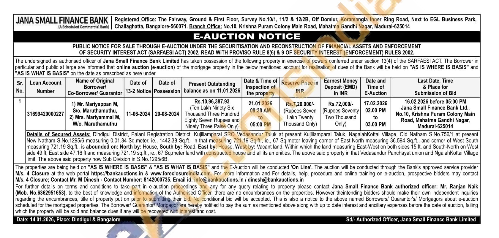 Dindigul District, Palani Registration District, Kujiliamparai SRO Vedasandur Taluk at present Kujiliamparai Taluk, Nagaiah Kottai Village, Old Natham S.No.756/1 at present New Natham S.No.1295/6 measuring 0.01.34 Sq.meter, ie., 1442.38 Sq.ft., in that measuring 721.19 Sq.ft., ie., 67 Sq.meter leaving comer of East-North measuring 36.594 Sq.ft., and corner of West-South measuring 721.19 Sq.ft., is abounded on: North by: House, South by: Road, East by: House, West by: Vacant land. Within which the land measuring East-West on both sides 15 ft, and South-North on West side 49 ft, East side 47.16 ft and measuring 721.19 sq.ft., ie., 67 Sq.meter land with constructed house and all its amenities. The above said property in that Vedasandur Panchayat union and Ngaiah Kottai Village limit. The above said property now Sub Division in S.No. 1295/68.
