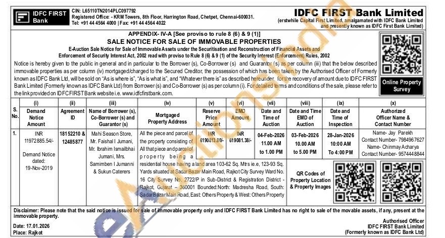 All the piece and parcel of the property consisting of All that piece and parcel of property being a residential house having a land area 103-62 Sq. Mtrs ie.e, 123-93 Sq. Yards situated at Sadar Bazar Main Road, Rajkot City Survey Ward No. 16 City Survey No. 2722/P in Sub-District & Registration District -Rajkot, Gujarat 360001 Bounded: North: Madresha Road, South: Sadar Bazar Main Road, East: Others Property & West: Others Property