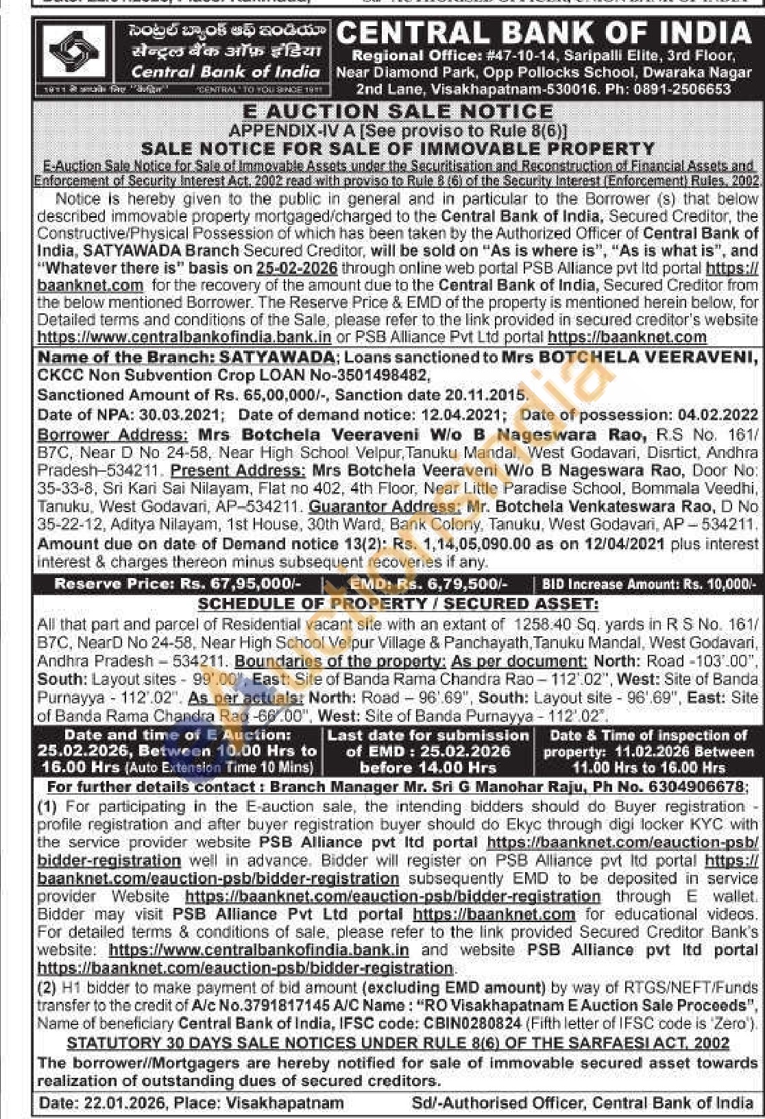 All that part and parcel of Residential vacant site with an extant of 1258.40 Sq, yards in R S No. 161/B7C, NearD No 24-58, Near High School Velpur Village & Panchayath, Tanuku Mandal, West Godavari, Andhra Pradesh-534211. Boundaries of the property: As per document: North: Road-103.00", South: Layout sites - 99.00", East: Site of Banda Rama Chandra Rao-112'.02", West: Site of Banda Purnayya-112.02". As per actuals: North: Road 96.69", South: Layout site 96'.69", East: Site of Banda Rama Chandra Rao-66.00", West: Site of Banda Purnayya - 112.02.