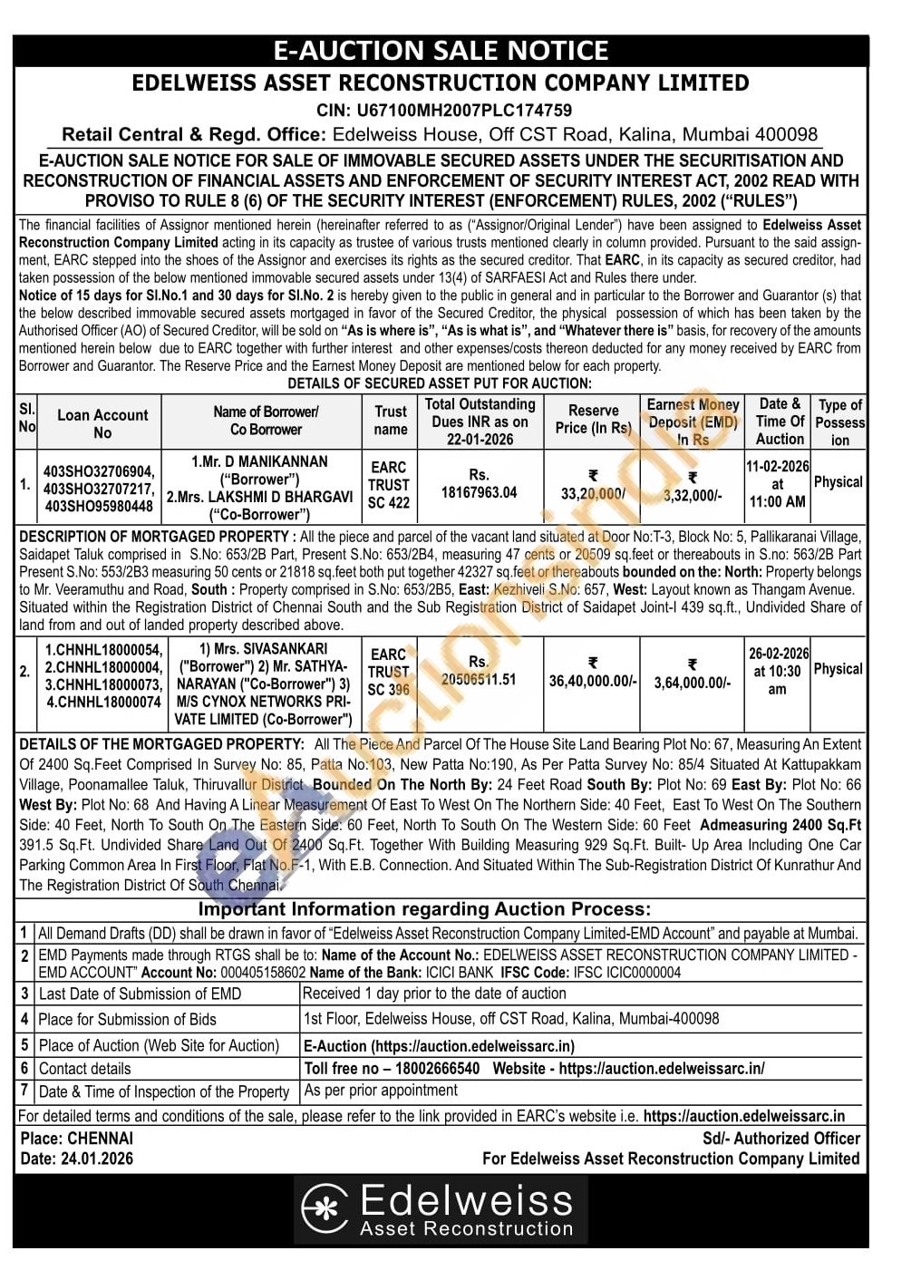 DETAILS OF THE MORTGAGED PROPERTY: All The Piece And Parcel Of The House Site Land Bearing Plot No: 67, Measuring An Extent Of 2400 Sq. Feet Comprised In Survey No: 85, Patta No:103, New Patta No:190, As Per Patta Survey No: 85/4 Situated At Kattupakkam Village, Poonamallee Taluk, Thiruvallur District Bounded On The North By: 24 Feet Road South By: Plot No: 69 East By: Plot No: 66 West By: Plot No: 68 And Having A Linear Measurement Of East To West On The Northern Side: 40 Feet, East To West On The Southern Side: 40 Feet, North To South On The Eastern Side: 60 Feet, North To South On The Western Side: 60 Feet Admeasuring 2400 Sq.Ft 391.5 Sq.Ft. Undivided Share Land Out Of 2400 Sq.Ft. Together With Building Measuring 929 Sq.Ft. Built Up Area Including One Car Parking Common Area In First Floor, Flat No.F-1, With E.B. Connection. And Situated Within The Sub-Registration District Of Kunrathur And The Registration District Of South Chennai.
