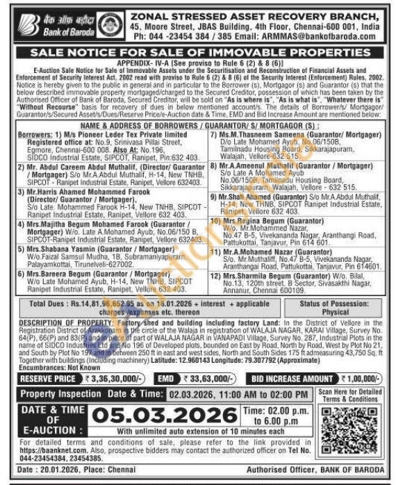 DESCRIPTION OF PROPERTY: Factory shed and building including factory Land: In the District of Vellore in the Registration District of Arakkonam in the circle of the Walaja in registration of WALAJA NAGAR, KARAI Village, Survey No. 64(P). 66(P) and 83(P) and in piece of part of WALAJA NAGAR in VANAPADI Village, Survey No. 287, Industrial Plots in the name of SIDCO Industries Ltd and No 196 of Developed plots, bounded on East by Road, North by Road, West by Plot No 21. and South by Plot No 197 and in between 250 It in east and west sides, North and South Sides 175 ft admeasuring 43,750 Sq. ft Together with buildings (Including machinery)
