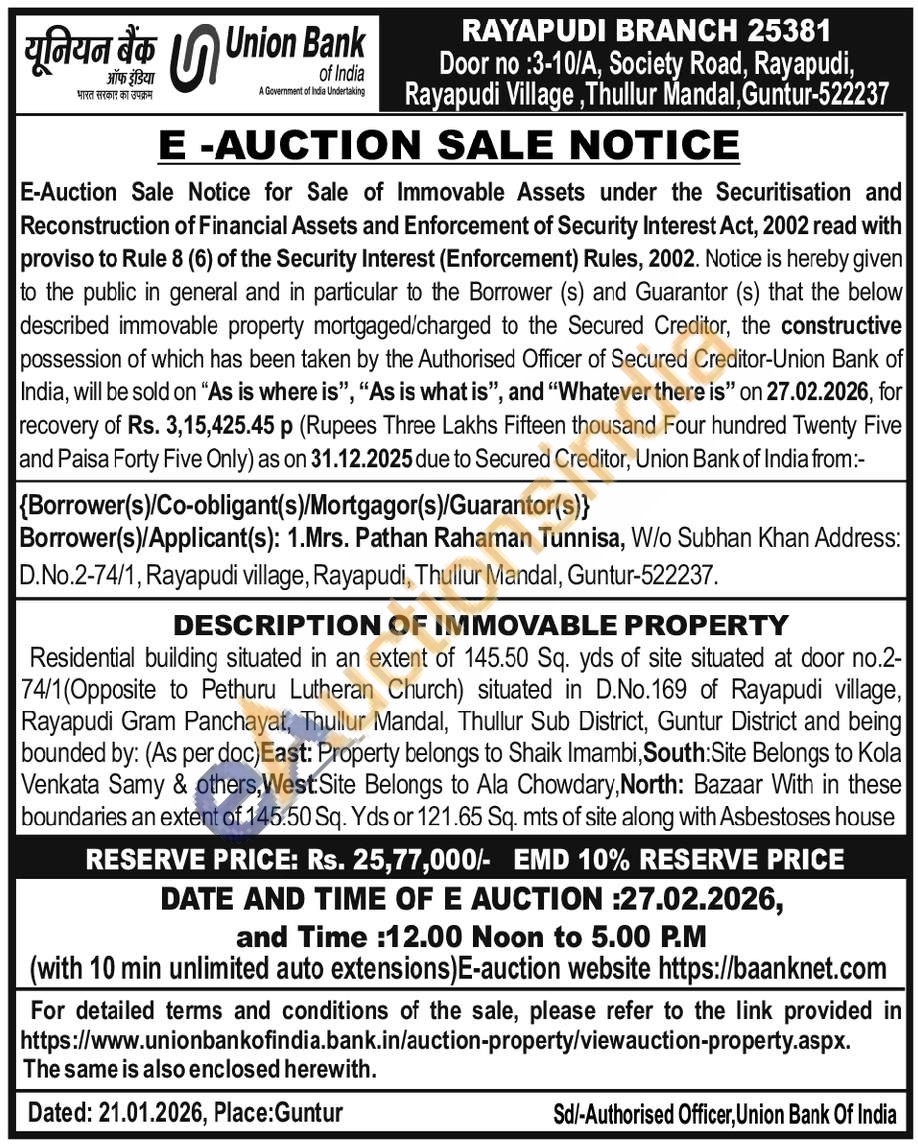 Residential building situated in an extent of 145.50 Sq. yds of site situated at door no.2-74/1(Opposite to Pethuru Lutheran Church) situated in D.No.169 of Rayapudi village, Rayapudi Gram Panchayat, Thullur Mandal, Thullur Sub District, Guntur District and being bounded by: (As per doc) East: Property belongs to Shaik Imambi, South: Site Belongs to Kola Venkata Samy & others, West Site Belongs to Ala Chowdary, North: Bazaar With in these boundaries an extent of 145.50 Sq. Yds or 121.65 Sq. mts of site along with Asbestoses house