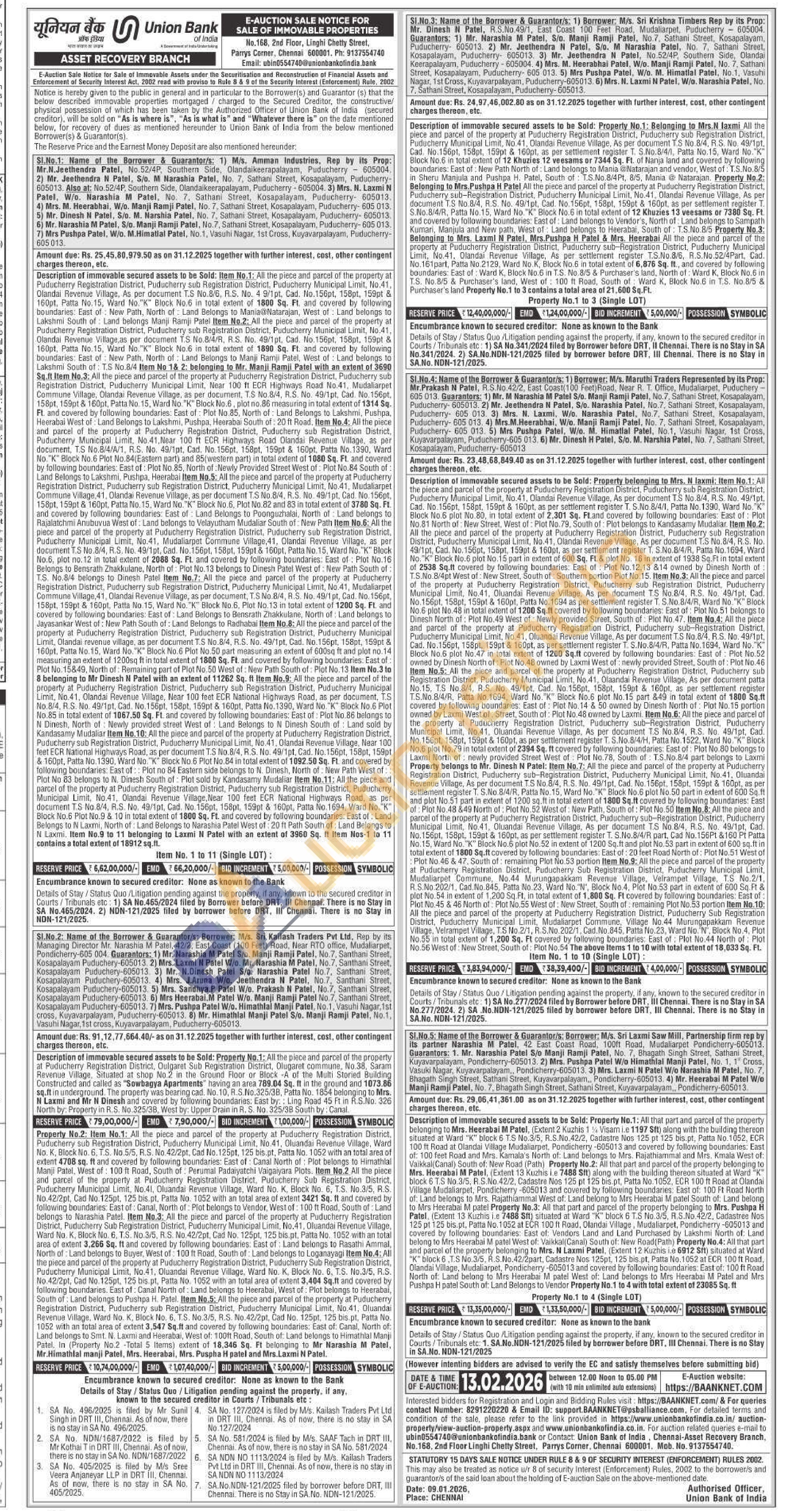 Description of immovable secured assets to be Sold: Item No.1: All the piece and parcel of the property at Puducherry Registration District, Puducherry sub Registration District, Puducherry Municipal Limit. No.41, Olandai Revenue Village, As per document T.S No.8/6, R.S. No. 4 9/1pt, Cad, No. 156pt, 158pt, 159pt & 160pt, Patta No.15, Ward No."K" Block No.6 in total extent of 1800 Sq. Ft. and covered by following boundaries: East of: New Path, North of Land Belongs to Mania@Natarajan, West of: Land belongs to Lakshmi South of Land bellongs Manji Ramji Patel Item No.2: All the piece and parcel of the property at Puducherry Registration District, Puducherry sub Registration District, Puducherry Municipal Limit, No.41, Olandai Revenue Village as per document T.S No.8/4/R, R.S. No. 49/1pt, Cad. No. 156pt, 158pt, 159pt & 160pt, Patta No.15, Ward No. "K" Block No.6 in total extent of 1890 Sq. Ft. and covered by following boundaries: East of New Path, North of Land Belongs to Manji Ramji Patel, West of Land belongs to Lakshmi South of: T.S No.8/4 Item No 1& 2: belonging to Mr. Manji Ramji Patel with an extent of 3690 Sq.ft Item No.3: All the piece and parcel of the property at Puducherry Registration District, Puducherry sub Registration District, Puducherry Municipal Limit, Near 100 ft ECR Highways Road No.41. Mudaliarpet Commune Village, Olandai Revenue Village, as per document, T.S. No.8/4, R.S. No. 49/1pt, Cad. No. 156pt, 158pt, 159pt & 160pt, Patta No. 15, Ward No. "K" Block No.6, plot no.86 measuring in total extent of 1314 Sq. Ft. and covered by following boundaries: East of: Plot No.85, North of: Land Belongs to Lakshmi, Pushpa, Heerabai West of Land Belongs to Lakshmi, Pushpa, Heerabai South of: 20 ft Road. Item No.4: All the piece and parcel of the property at Puducherry Registration District, Puducherry sub Registration District, Puducherry Municipal Limit. No.41, Near 100 ft ECR Highways Road Olandai Revenue Village, as per document. T.S No.8/4/A/1, R.S. No. 49/1pt, Cad. No. 156pt, 158pt, 159pt & 160pt. Patta No.1390, Ward No. "K" Block No.6 Plot No.84(Eastern part) and 85(western part) in total extent of 1080 Sq. Ft. and covered by following boundaries: East of: Plot No.85, North of: Newly Provided Street West of: Plot No.84 South of: Land Belongs to Lakshmi, Pushpa, Heerabai Item No.5: All the piece and parcel of the property at Puducherry Registration District, Puducherry sub Registration District, Puducherry Municipal Limit, No.41, Mudaliarpet Commune Village, 41, Olandai Revenue Village, as per document T.S No.8/4, R.S. No. 49/1 pt. Cad. No. 156pt, 158pt, 159pt & 160pt, Patta No. 15, Ward No. "K" Block No.6, Plot No.82 and 83 in total extent of 3780 Sq. Ft. and covered by following boundaries: East of Land Belongs to Poonguzhalai, North of Land belongs to Rajalatchmi Anubuvua West of: Land belongs to Velayutham Mudaliar South of New Path Item No.6: All the piece and parcel of the property at Puducherry Registration District, Puducherry sub Registration District, Puducherry Municipal Limit, No.41, Mudaliarpet Commune Village, 41, Olandai Revenue Village, as per document T.S No.8/4, R.S. No. 49/1pt, Cad. No.156pt, 158pt, 159pt & 160pt, Patta No. 15, Ward No. "K" Block. No.6, plot no. 12 in total extent of 2088 Sq. Ft. and covered by following boundaries: East of Plot No.16 Belongs to Bensrath Zhakkulane, North of: Plot No.13 belongs to Dinesh Patel West of: New Path South of: T.S. No.8/4 belongs to Dinesh Patel Item No.7: All the piece and parcel of the property at Puducherry Registration District, Puducherry sub Registration District, Puducherry Municipal Limit, No.41, Mudaliarpet Commune Village, 41, Olandai Revenue Village, as per document, T.S No.8/4, R.S. No. 49/1 pt, Cad. No. 156pt, 158pt, 159pt & 160pt, Patta No.15, Ward No. "K" Block No.6. Plot No. 13 in total extent of 1200 Sq. Ft. and covered by following boundaries: East of: Land Belongs to Bensrath Zhakkulane, North of: Land belongs to Jayasankar West of: New Path South of: Land Belongs to Radhabai Item No.8: All the piece and parcel of the property at Puducherry Registration District, Puducherry sub Registration District, Puducherry Municipal Limit, Olandai revenue village, as per document T.S No.8/4, R.S. No. 49/1pt, Cad. No. 156pt, 158pt, 159pt & 160pt, Patta No. 15, Ward No. "K" Block No.6 Plot No.50 part measuring an extent of 600sq ft and plot no.14 measuring an extent of 1200sq ft in total extent of 1800 Sq. Ft. and covered by following boundaries. East of: Plot No. 15849, North of: Remaining part of Plot No.50 West of: New Path South of: Plot No.13 Item No.3 to 8 belonging to Mr Dinesh N Patel with an extent of 11262 Sq. ft Item No.9: All the piece and parcel of the property at Puducherry Registration District, Puducherry sub Registration District, Puducherry Municipal Limit, No.41, Olandai Revenue Village, Near 100 feet ECR National Highways Road, as per document, T.S No.8/4, R.S. No. 49/1pt, Cad. No. 156pt, 158pt, 159pt & 160pt, Patta No.1390, Ward No. "K" Block No.6 Plot No.85 in total extent of 1067.50 Sq. Ft. and covered by following boundaries: East of: Plot No.86 belongs to N Dimesh, North of Newly provided street West of Land Belongs to N Dinesh South of Land sold by Kandasamy Mudaliar Item No.10: All the piece and parcel of the property at Puducherry Registration District, Puducherry sub Registration District, Puducherry Municipal Limit, No. 41, Olandai Revenue Village, Near 100 feet ECR National Highways Road, as per document T.S No.8/4, R.S. No. 49/1pt, Cad. No. 156pt, 158pt, 159pt & 160pt, Patta No.1390, Ward No. "K" Block No. 6 Plot No.84 in total extent of 1092.50 Sq. Ft. and covered by following boundaries: East of:: Plot no 84 Eastern side belongs to N. Dinesh, North of New Path West of:: Plot No 83 belongs to N. Dinesh South of Plot sold by Kandasamy Mudaliar Item No.11: All the piece and parcel of the property at Puducherry Registration District, Puducherry sub Registration District, Puducherr
