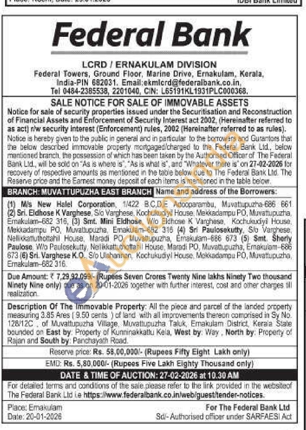 Description Of The Immovable Property: All the piece and parcel of the landed property measuring 3.85 Ares (9.50 cents) of land with all improvements thereon comprised in Sy No. 128/12C, of Muvattupuzha Village, Muvattupuzha Taluk, Ernakulam District, Kerala State bounded on East by: Property of Kunninakkattu Kela, West by: Way, North by: Property of Rajan and South by: Panchayath Road