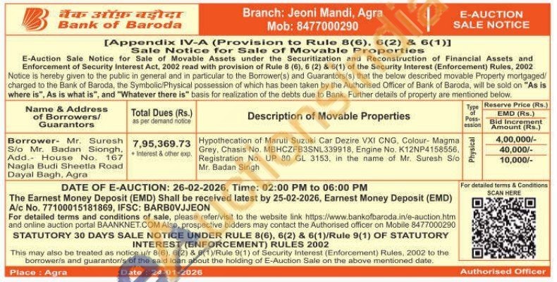 Hypothecation of Maruti Suzuki Car Dezire VXI CNG, Colour- Magma Grey, Chasis No. MBHCZFB3SNL339918, Engine No. K12NP4158556. Registration No. UP 80 GL 3153, in the name of Mr. Suresh Slo Mr. Badan Singh