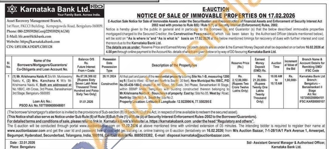 All that part and parcel of the residential property bearing Site No.1-B, measuring 1200 sq ft (East to West 40 feet and North to South: 30 feet), New Municipal No. 188/C, PID No.55-439-188-C situated at 4th Cross, 5th Block, 3rd Phase, Banashankari Ill Stage, within BBMP limits, Bengaluru with building constructed thereon belonging to Mr.Krishnama Naidu K. Boundaries of property: East by: Site No.05, West by: Road, North by: Site No. 1-A, South by: Site No 2