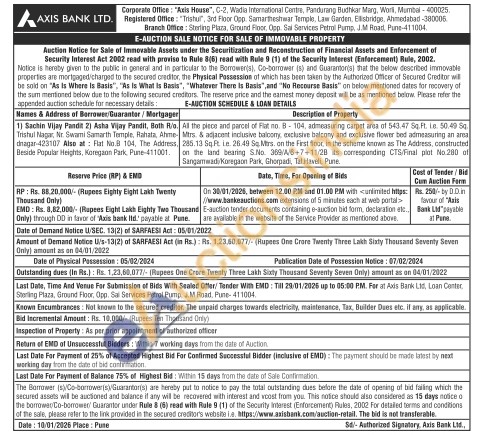 All the piece and parcel of Fiat no. 8-104, admeasuring carpet area of 543.47 50. Ft. L. 50.49 54 Mtrs & adjacent inclusive balcony, exclosive balcony and exclusive flower bed admeasuring an area 285.13 80 Ft. in. 26.49 Sg Mrs. on the First floor, in the scheme known as The Address, constructed on the land bearing S.No. 389/A/6+7+11/28 its corresponding CTS/Final plot No.280 of Sangamwad Koregaon Park, Ghorpadi, Tal Haveli, Pune
