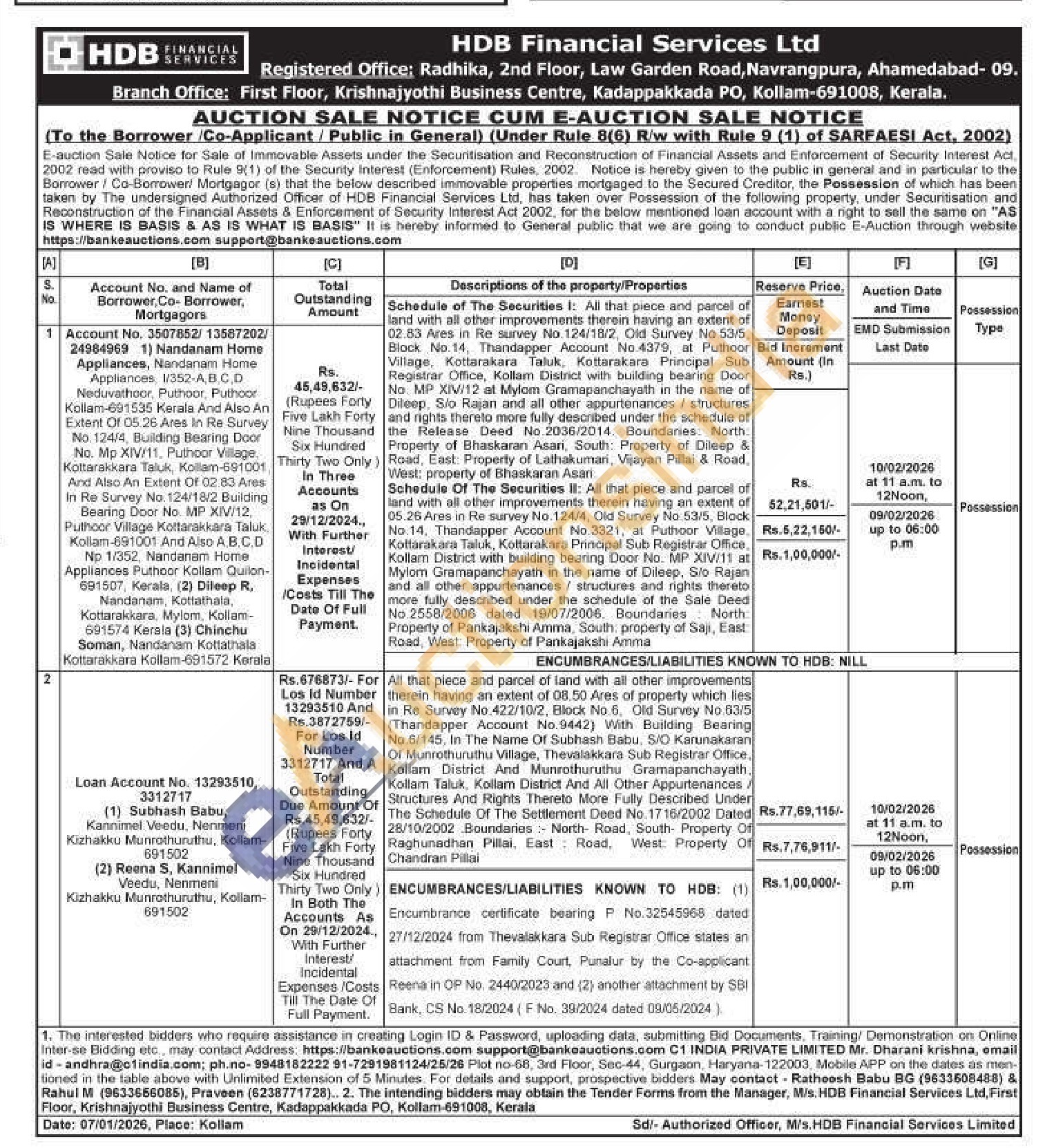 Schedule of The Securities I: All that piece and parcel of land with all other improvements therein having an extent of 02.83 Ares in Re survey No. 124/18/2, Old Survey No 53/5 Block No.14, Thandapper Account No.4379, at Puthoor Village, Kottarakara Taluk, Kottarakara Principal Sub Registrar Office, Kollam District with building bearing Door No. MP XIV/12 at Mylom Gramapanchayath in the name of Dileep, Slo Rajan and all other appurtenances/structures and rights thereto more fully described under the schedule of the Release Deed No. 2036/2014. Boundaries: North Property of Bhaskaran Asari, South: Property of Dileep & Road, East: Property of Lathakumari, Vijayan Pillai & Road, West: property of Bhaskaran Asari Schedule Of The Securities II: All that piece and parcel of land with all other improvements therein having an extent of 05.26 Ares in Re survey No.124/4, Old Survey No 53/5, Block No.14, Thandapper Account No.3321, at Puthoor Village Kottarakara Taluk, Kottarakara Principal Sub Registrar Office Kollam District with building bearing Door No. MP XIV/11 at Mylom Gramapanchayath in the name of Dileep, Sio Rajan and all other appurtenances / structures and rights thereto more fully described under the schedule of the Sale Deed No. 2558/2006 dated 19/07/2006. Boundaries. North Property of Pankajakshi Amma, South property of Saji, East Road, West: Property of Pankajakshi Amma