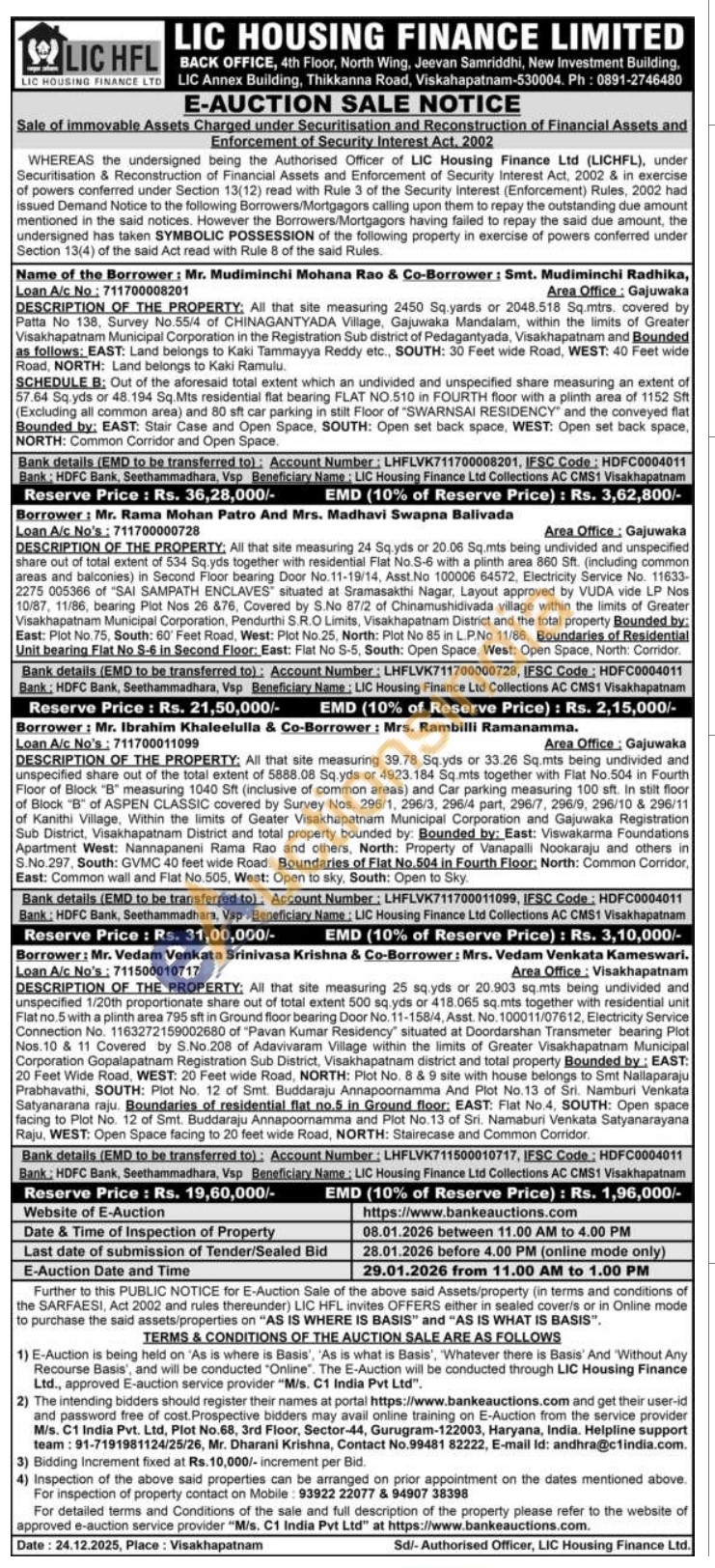 DESCRIPTION OF THE PROPERTY All that site measuring 25 sq yds or 20.903 sq.mts being undivided and unspecified 1/20th proportionate share out of total extent 500 sq. yds or 418.065 sq.mts together with residential unit Flat no 5 with a plinth area 795 aft in Ground floor bearing Door No. 11-158/4, Asst. 1 158/4, Asst. No, 100011/07612, Electricity Service Connection No. 1163272159002680 of 'Pavan Kumar Residency situated at Doordarshan Transmeter bearing Plot Nos. 10 & 11 Covered by S.No 208 of Adavivaram Village within the limits of Greater Visakhapatnam Municipal Corporation Gopalapatnam Registration Sub District, Visakhapatnam district and total property Bounded by: EAST: 20 Feet Wide Road, WEST: 20 Feet wide Road, NORTH: Plot No. 8 & 9 site with house belongs to Smt Nallaparaju Prabhavathi, SOUTH: Plot No. 12 of Smt. Buddaraju Annapoornamma And Plot No. 13 of Sri. Namburi Venkata Satyanarana arana raju. Boundaries o Boundaries of residential flat no.5 in Ground floor, EAST: FI EAST: Fiat No 4 14. SOUTH: Open space facing to Plot No 12 of Smt. Buddaraju Annapoornamma and Plot No.13 of Sri. Namaburi Venkata Satyanarayana Raju, WEST: Open Space facing to 20 feet wide Road, NORTH: Stairecase Common Comidor.
