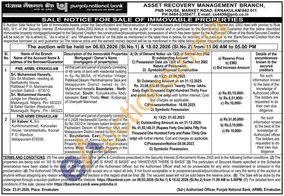 All that part and parcel of property consisting of 49 cents of land with residential building in Sy No.86/5A, of Kizhattur Village, Pattikkad Desam, Perinthalmanna Taluk and Malappuram District owned by Sri. Muhammed Haneefa. Boundaries: North: Vellachal; South: Puliyakkuthu Abdu kaivasam; East: Thodu; West: Kudiyirupp of Cheriyath Mammad