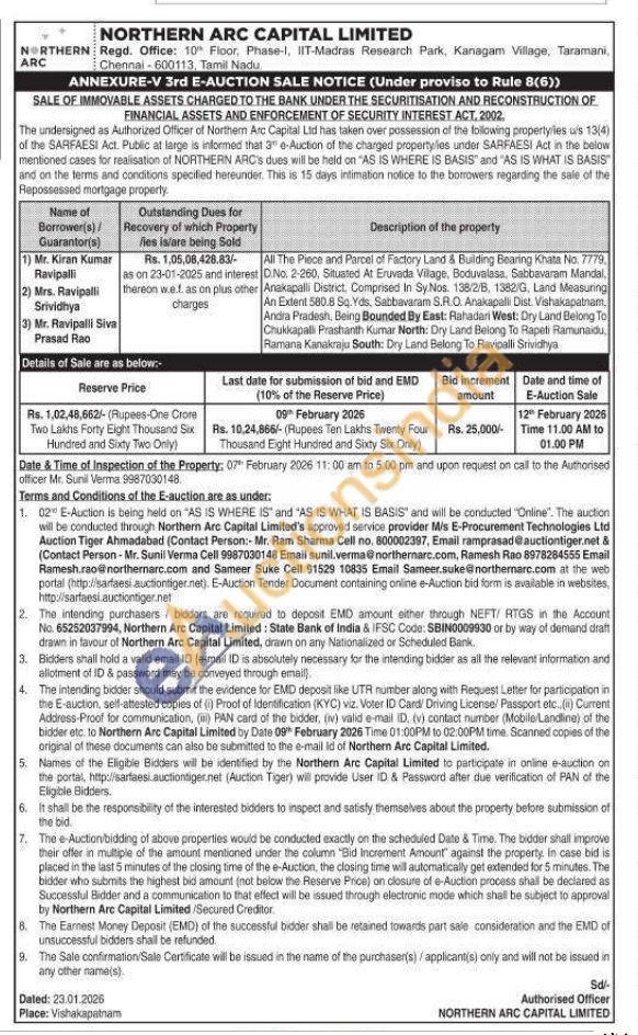 All The Piece and Parcel of Factory Land & Building Bearing Khata No. 7779, D.No. 2-260, Situated At Eruvada Village, Boduvalasa, Sabbavaram Mandal, Anakapalli District, Comprised In Sy. Nos. 138/2/8, 1382/G, Land Measuring An Extent 580.8 Sq. Yds, Sabbavaram S.R.O. Anakapalli Dist. Vishakapatnam, Andra Pradesh, Being Bounded By East: Rahadari West: Dry Land Belong To Chukkapalli Prashanth Kumar North: Dry Land Belong To Rapeti Ramunaidu, Ramana Kanakraju South: Dry Land Belong To Ravipalli Srividhya