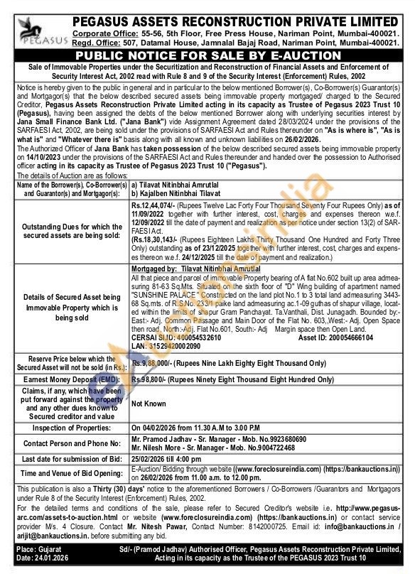 All that piece and parcel of immovable Property bearing of A flat No.602 built up area admea-suring 81-63 Sq.Mts. Situated on the sixth floor of "D" Wing building of apartment named "SUNSHINE PALACE" Constructed on the land plot No.1 to 3 total land admeasuring 3443-68 Sq.mts. of R.S.No. 233/1 paike land admeasuring ac.1-09 guthas of shapur village, locat-ed within the limits of shapur Gram Panchayat. Ta.Vanthali, Dist. Junagadh. Bounded by:-East: Adj. Common Passage and Main Door of the Flat No. 603,,West:- Adj. Open Space then road, North: Adj. Flat No.601, South:- Adj Margin space then Open Land.