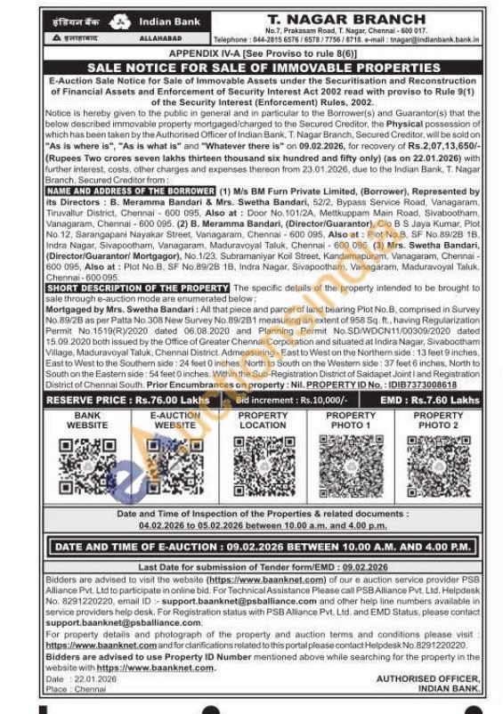 the specific details of the property intended to be brought to sale through e-auction mode are enumerated below: Mortgaged by Mrs. Swetha Bandari: All that piece and parcel of land bearing Plot No. B, comprised in Survey No.89/28 as per Patta No 308 New Survey No. 89/281 measuring an extent of 958 Sq. ft., having Regularization Permit No.1519(R)/2020 dated 06.08.2020 and Planning Permit No SD/WDCN11/00309/2020 dated 15.09.2020 both issued by the Office of Greater Chennai Corporation and situated at Indira Nagar, Sivabootham Village, Maduravoyal Taluk, Chennai District Admeasuring-East to West on the Northern side: 13 feet 9 inches, East to West to the Southern side: 24 feet 0 inches, North to South on the Western side: 37 feet 6 inches, North to South on the Eastern side: 54 feet 0 inches, Within the Sub-Registration District of Saidapet Joint I and Registration District of Chennai South. Prior Encumbrances on property: Nil. PROPERTY ID No.: IDIB7373008618
