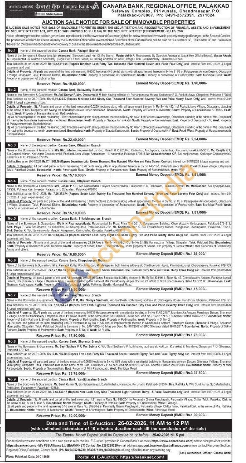 Details of Property: All part & parcel of the land Admeasuring 0.0126 Hectares & residential building thereon in Re Sy No 374/15-1. Block No 42, Cherpulassery Amsom, Panniyamkurissi Desom, Cherpulassery Village, Ottapalam Taluk, Palakkad District in the name of Mrs Parvathikutty as per Doc No 793/2008 of SRO Cherpulassery Dated 13.02.2008. Boundaries: East: Thankam Kudiyiruppu North: Property of Raru & Venugopal, West: Pathway, South: Municipal Road