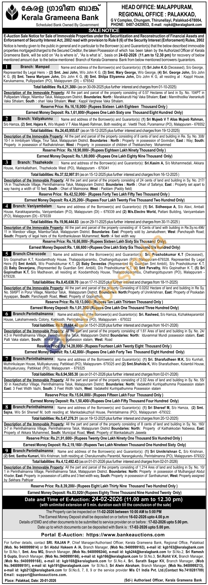 Description of the Immovable Property: All the part and parcel of the property consisting of 24 cents of land and building in Sy. No. 217/1A in Thazhekode Village, Perinthalmanna Taluk, Malappuram District. Boundaries: North: Ohari of Safariya; East: Property set apart to way having a width of 10 feet; South: Ohari of Maimoona; West: Paddam (Paddy field