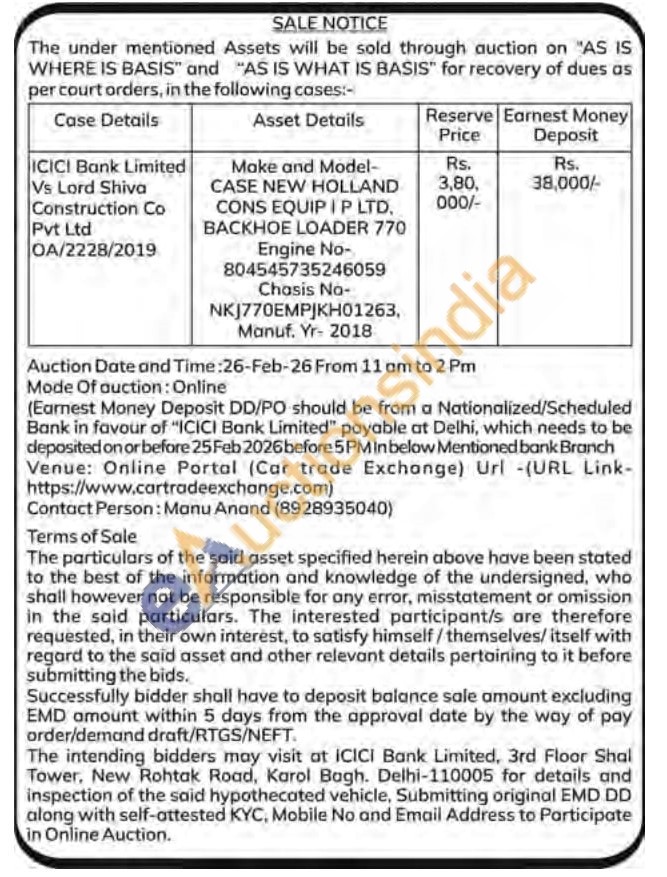 Make and Model-CASE NEW HOLLAND CONS EQUIP IP LTD. BACKHOE LOADER 770 Engine No-804545735246059 Chasis No-NKJ770EMPJKH01263, Manuf. Yr- 2018