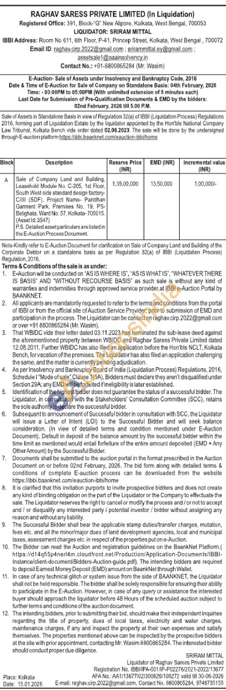 ASale of Company Land and Building, Leasehoid Module No. C-205, 1st Fluox, South West side standard design factory-Call (SDF), Project Name- Paridhan Garment Pak. Premises No. 19. PS-Blelighata, Ward No. 57. Kolkata-700015. (Austle 3547)