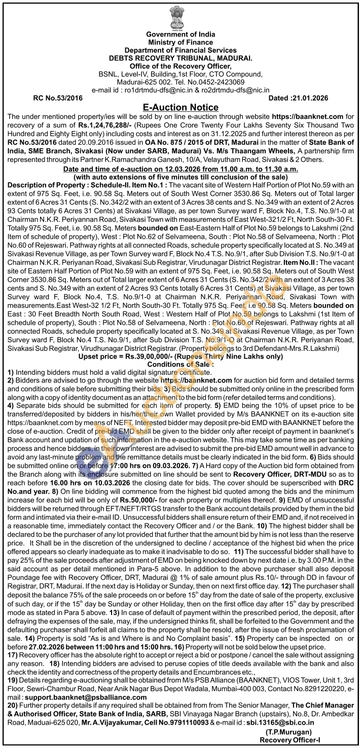 Description of Property: Schedule-ll. Item No.1: The vacant site of Western Half Portion of Plot No.59 with an extent of 975 Sq. Feet, i.e. 90.58 Sq. Meters out of South West Comer 3530.86 Sq. Meters out of Total larger extent of 6 Acres 31 Cents (S. No.342/2 with an extent of 3 Acres 38 cents and S. No.349 with an extent of 2 Acres 93 Cents totally 6 Acres 31 Cents) at Sivakasi Village, as per town Survey ward F. Block No.4, T.S. No.9/1-0 at Chairman N.K.R. Periyannan Road, Sivakasi Town with measurements of East West-321/2 Ft. North South-30 Ft. Totally 975 Sq. Feet, i.e. 90.58 Sq. Meters bounded on East-Eastern Half of Plot No.59 belongs to Lakshmi (2nd) Item of schedule of property), West: Plot No.62 of Selvameena, South: Plot No.58 of Selvameena, North: Plot No.60 of Rejeswari. Pathway rights at all connected Roads, schedule property specifically located at S. No.349 at Sivakasi Revenue Village, as per Town Survey ward F. Block No.4 T.S. No.9/1, after Sub Division T.S. No.9/1-0 at Chairman N.K.R. Periyanan Road, Sivakasi Sub Registrar, Virudunagar District Registrar. Item No.II: The vacant site of Eastern Half Portion of Plot No. 59 with an extent of 975 Sq. Feet, le. 90.58 Sq. Meters out of South West Corner 3530.86 Sq. Meters out of Total larger extent of 6 Acres 31 Cents (S. No.342/2 with an extent of 3 Acres 38 cents and S. No.349 with an extent of 2 Acres 93 Cents totally 6 Acres 31 Cents) at Sivakasi Village, as per town Survey ward F. Block No.4, T.S. No.9/1-0 at Chairman N.K.R. Periyannan Road, Sivakasi Town with measurements.East West-32 1/2 Ft, North South-30 Ft. Totally 975 Sq. Feet, le 90.58 Sq. Meters bounded on East: 30 Feet Breadth North South Road, West: Western Half of Plot No.59 belongs to Lakshmi (1st Item of schedule of property), South: Plot No.58 of Selvameena, North: Plot No.60 of Rejeswari. Pathway rights at all connected Roads, schedule property specifically located at S. No.349 at Sivakasi Revenue Village, as per Town Survey ward F, Block No.4 T.S. No 9/1, after Sub Division T.S. No.9/1-0 at Chairman N.K.R. Periyanan Read, Sivakasi Sub Registrar, Virudhunagar District Registrar. (Property belongs to 3rd Defendant-Mrs.R.Lakshmi)