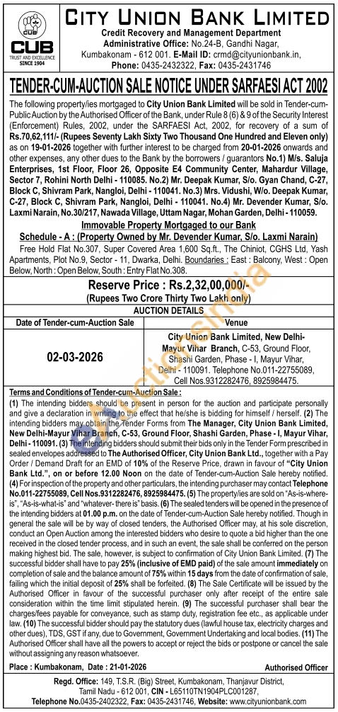 Free Hold Flat No.307, Super Covered Area 1,600 Sq.ft., The Chiniot, CGHS Ltd, Yash Apartments, Plot No.9, Sector 11, Dwarka, Delhi. Boundaries: East: Balcony, West: Open Below, North: Open Below, South: Entry Flat No. 308.