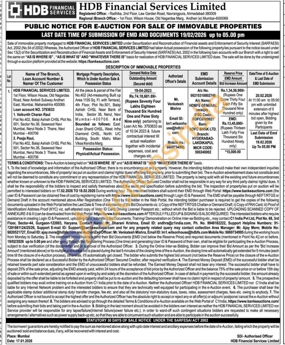 All the piece & parcel of the Flat No.402 (Ad-measuring Built up Area 1105 Sq. Ft. with Terrace). 4th Floor, Plot No.501, Balaji Ashish CHSL, Near Bank of India, Sector 36, Nerul, Navi Mumbai-400706. And Bounded as follows: East: Jivan Shanti CHSL, West: Infra Diamond CHSL, North: U/C Building, South: Matru Milan Vikas Kendra Marg