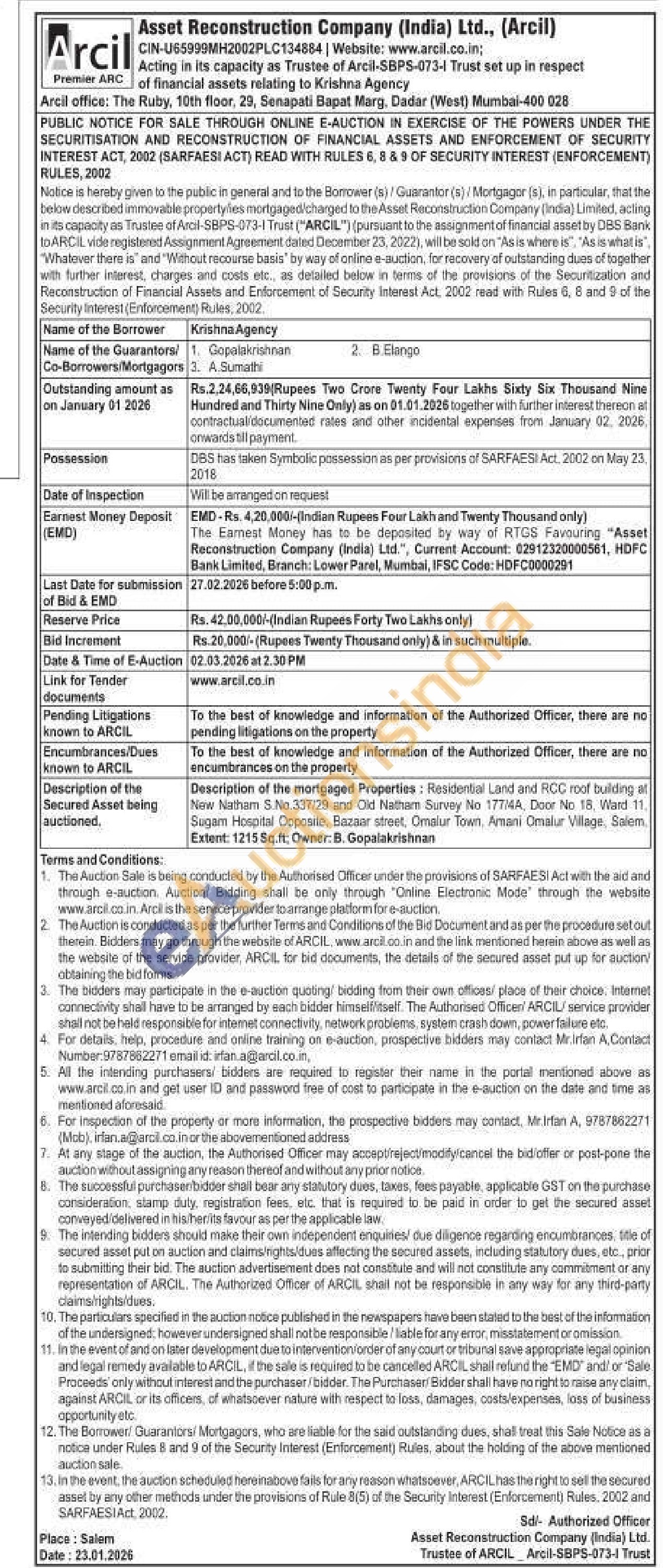Description of the mortgaged Properties: Residential Land and RCC roof building at New Natham S.No.337/29 and Old Natham Sarvey No 177/44, Door No 18. Ward 11 Sugam Hospital Opposite, Bazaar street, Omalur Town. Amani Omalur Village, Salom Extent: 1215 Sq.ft: Owner: B. Gopalakrishnan