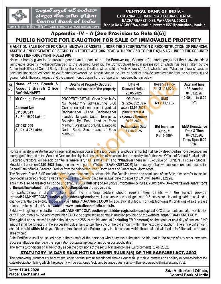 PROPERTY DETAIL: Open Place in Sy No 464-E/1/1/2 admeasuring 0.06 Guntas located near market yard, at Bachannapet village, Bachannapet mandal, Jangaon Distt., Telangana. Bounded By: East: Land of Eddu Madhuri; West: Land of Eddu Damodar: North: Road; South: Land of Eddu Madhuri