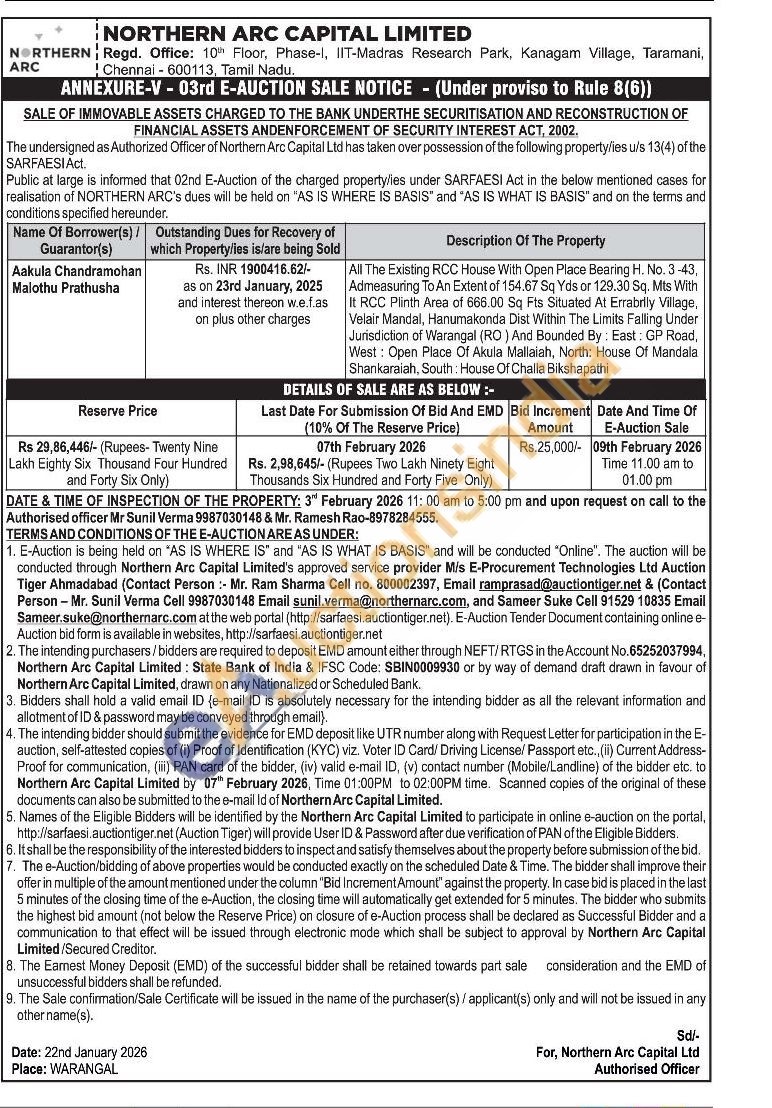 All The Existing RCC House With Open Place Bearing H. No. 3-43, Admeasuring To An Extent of 154.67 Sq Yds or 129.30 Sq. Mts With It RCC Plinth Area of 666.00 Sq Fts Situated At Errabrliy Village, Velair Mandal, Hanumakonda Dist Within The Limits Falling Under Jurisdiction of Warangal (RO) And Bounded By: East: GP Road, West: Open Place Of Akula Mallaiah, North: House Of Mandala Shankaraiah, South: House Of Challa Bikshapathi