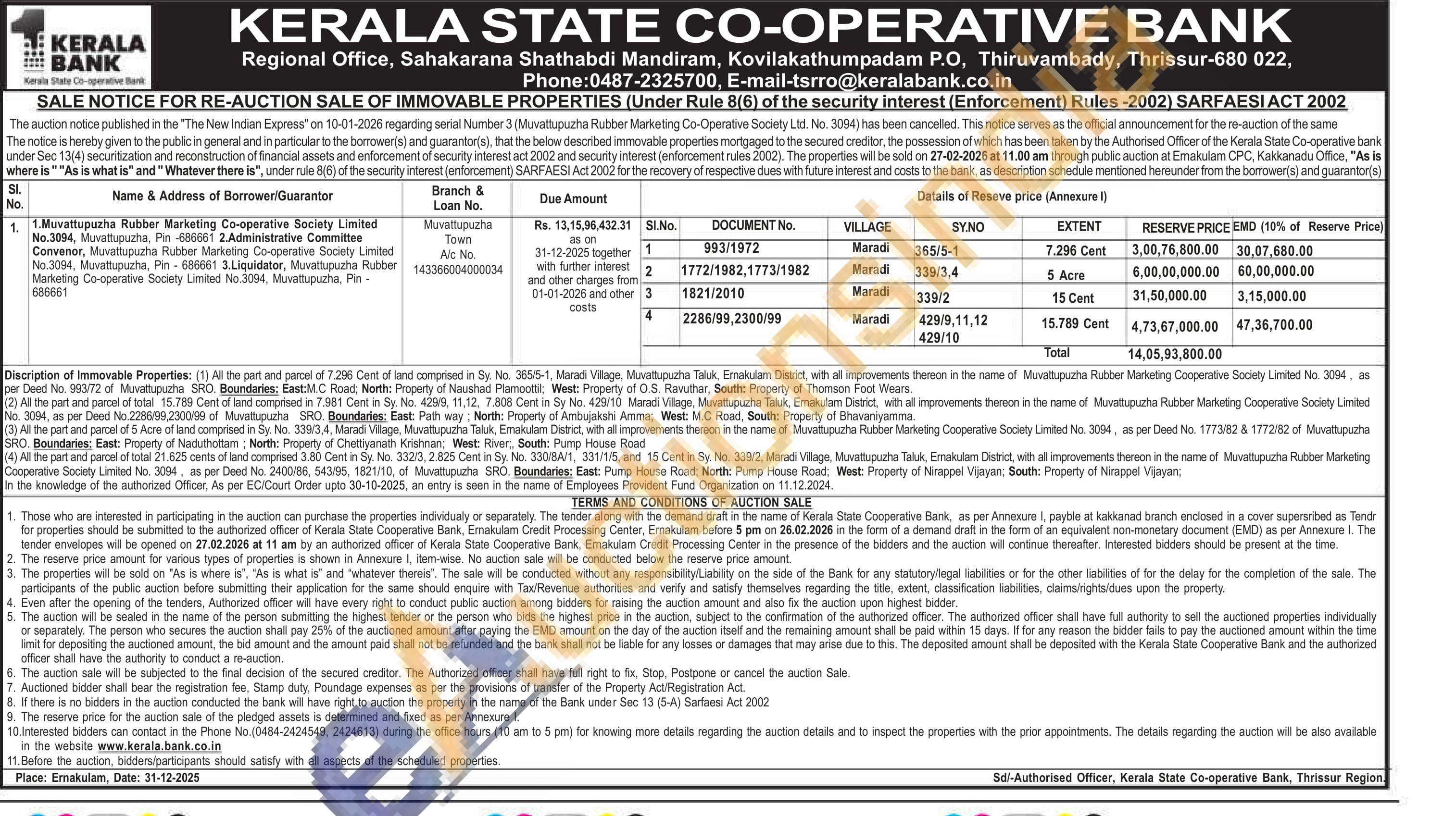 All the part and parcel of 5 Acre of land comprised in Sy. No. 336/3,4, Maradi Village, Muvattupuzha Taluk, Emakulam District, with all improvements thereon in the name of Muvattupuzha Rubber Marketing Cooperative Society Limited No. 3094, as per Deed No. 1773/82 & 1772/82 of Muvattupuzha SRO. Boundaries; East: Property of Naduthottam. North: Property of Chettyanath Krishnan, West: River, South: Pump House Road