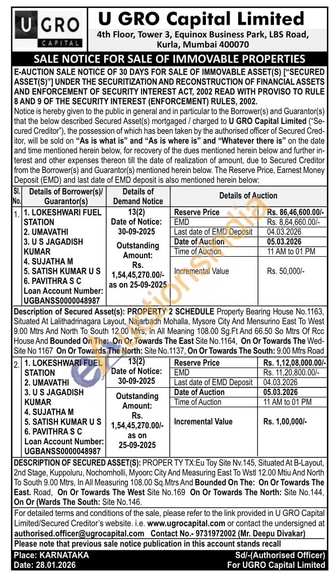 Description of Secured Asset(s): PROPERTY 2 SCHEDULE Property Bearing House No. 1163, Situated At Lalithadrinagara Layout, Najarbadh Mohalla, Mysore City And Mensurino East To West 9.00 Mtrs And North To South 12.00 Mfrs, In All Meaning 108.00 Sg.Ft And 66.50 So Mtrs Of Rcc House And Bounded On The: On Or Towards The East Site No.1164, On Or Towards The Wed-Site No 1167 On Or Towards The North: Site No. 1137, On Or Towards The South: 9.00 Mfrs Road