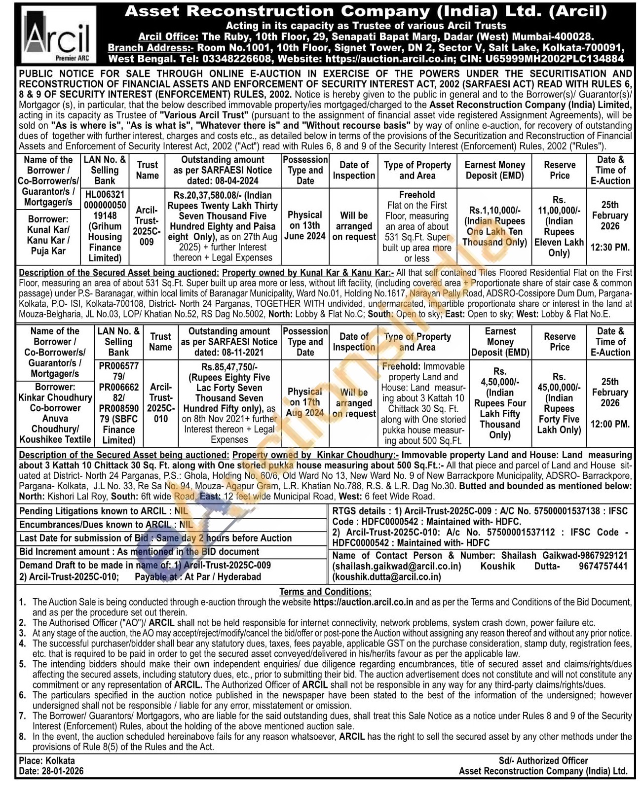 Description of the Secured Asset being auctioned: Property owned by Kinkar Choudhury:- Immovable property Land and House: Land measuring about 3 Kattah 10 Chittack 30 Sq. Ft. along with One storied pukka house measuring about 500 Sq.Ft.:- All that piece and parcel of Land and House sit-uated at District- North 24 Parganas, P.S.: Ghola, Holding No. 60/6, Old Ward No 13, New Ward No. 9 of New Barrackpore Municipality, ADSRO- Barrackpore, Pargana- Kolkata, J.L No. 33, Re Sa No. 94, Mouza-Agapur Gram, L.R. Khatian No.788, R.S. & L.R. Dag No.30. Butted and bounded as mentioned below: North: Kishori Lal Roy, South: 6ft wide Road, East: 12 feet wide Municipal Road, West: 6 feet Wide Road.