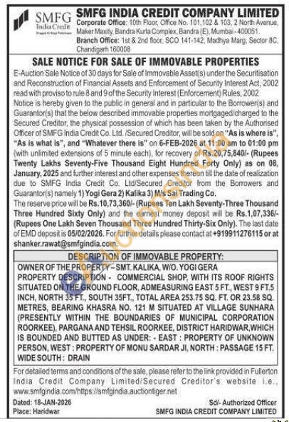 OWNER OF THE PROPERTY-SMT. KALIKA, W/O. YOGI GERA PROPERTY DESCRIPTION COMMERCIAL SHOP, WITH ITS ROOF RIGHTS SITUATED ON THE GROUND FLOOR, ADMEASURING EAST 5 FT., WEST 9 FT.5 INCH, NORTH 35 FT, SOUTH 35FT., TOTAL AREA 253,75 SQ. FT. OR 23.58 SQ. METRES, BEARING KHASRA NO. 121 M SITUATED AT VILLAGE SUNHARA (PRESENTLY WITHIN THE BOUNDARIES OF MUNICIPAL CORPORATION ROORKEE), PARGANA AND TEHSIL ROORKEE, DISTRICT HARIDWAR, WHICH IS BOUNDED AND BUTTED AS UNDER: EAST: PROPERTY OF UNKNOWN PERSON, WEST: PROPERTY OF MONU SARDAR JI, NORTH: PASSAGE 15 FT. WIDE SOUTH: DRAIN