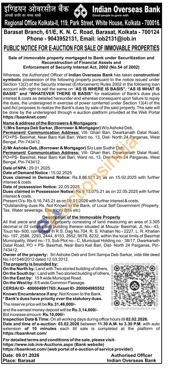 All that piece and parcel of property consisting of land measuring an area of 3.305 decimal or 02 cottahs and building thereon situated at Mouza- Basirhat, JL No.- 43, Touzi No-600, comprised in R.S. Dag No.704, R. S. Khatian No-2227, L. R. Khatian No- 197, 2586, 2293, 2444, 8153, 2652, 9578, 8232, within the local limits of Basirhat Municipality, Ward no.-13, Sub Plot no.-C. Municipal Holding no.-38/17, Dwarkanath Dalal Road, PO + PS- Basirhat, Near Baro Kali Bari, Dist- North 24 Parganas, Pin-743412.The property is bounded by: On the North by: Land with Two storied building of others, On the South by: Land with Two storied building of others, On the East by: 15 ft wide Municipal Road. On the West by: 8 ft wide Common Passage. CERSAI ID-400004991765; Asset ID-200004985552