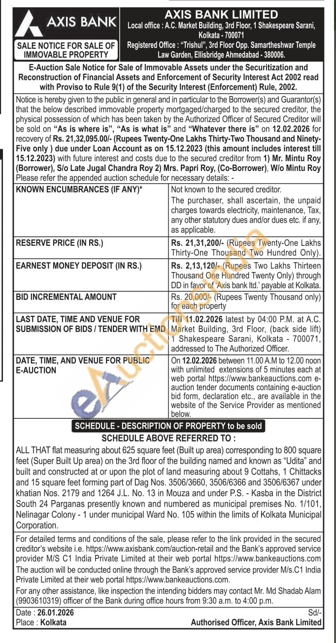 ALL THAT flat measuring about 625 square feet (Built up area) corresponding to 800 square feet (Super Built Up area) on the 3rd floor of the building named and known as "Udita" and built and constructed at or upon the plot of land measuring about 9 Cottahs, 1 Chittacks and 15 square feet forming part of Dag Nos. 3506/3660, 3506/6366 and 3506/6367 under khatian Nos. 2179 and 1264 J.L. No. 13 in Mouza and under P.S. Kasba in the District South 24 Parganas presently known and numbered as municipal premises No. 1/101, Nelinagar Colony 1 under municipal Ward No. 105 within the limits of Kolkata Municipal Corporation.