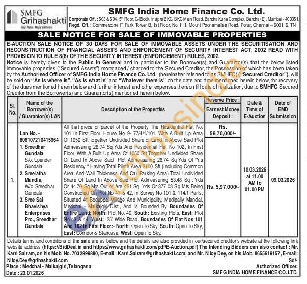 All that piece or parcel of the Property The Residential Flat No. 101 In First Floor, House No. 9-77/4/1/101, With A Built Up Area Of 1050 Sft Together Undivided Share of Land In Above Said Plot Admeasuring 26.74 Sq Yds And Residential Flat No 102, In First Floor, With A Built Up Area Of 1050 Sft Together Undivided Share Of Land In Above Said Plot Admeasuring 26.74 Sq Yds Of "Y.s Residency "Having Total Plinth Area 2100 Stt (Including Common Area And Wall Thickness And Car Parking Area) Total Undivided Share Of Land In Above Said Plot Admeasuring 53.48 Sq. Yds Or 44.70 Sq Mts Out of Are 451 Sq Yds Or 377.03 Sq Mts Being Constructed On Plot No 41 & 42, In Survey No 101 & 114/1 Parts, Situated At Boduppal Village And Municipality, Medipally Mandal, Medchal Malkajgirni Dist., And Is Bounded By Boundaries Of Entire Land: North: Plot No. 40, South: Existing Plots, East: Plot No 43 & 44, West: 25 Wide Road, Boundaries Of Flat Nos 101 And 102 In First Floor:- North: Open To Sky, South: Open To Sky, East: Corridor & Staircase, West: Open To Sky